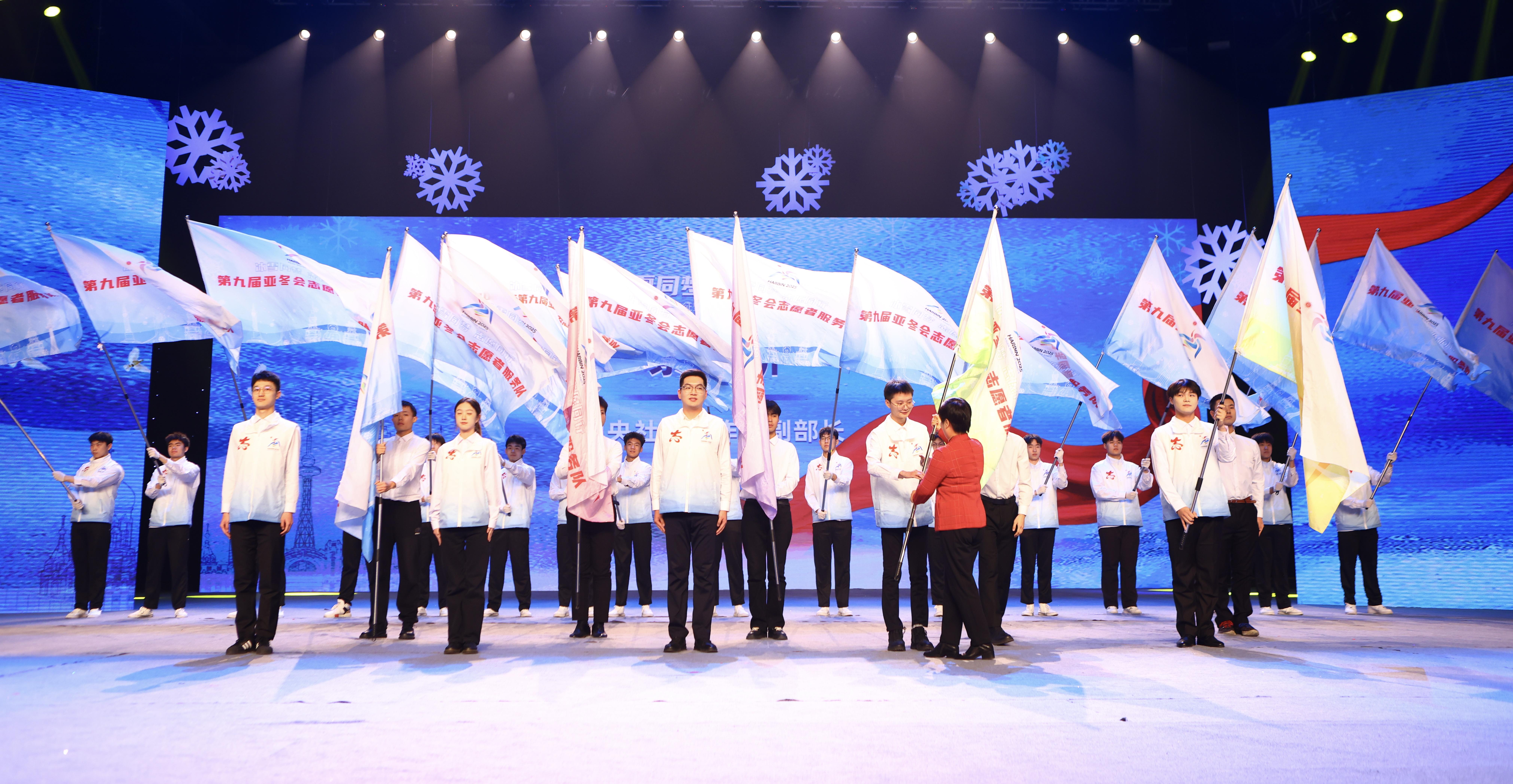 中央社会工作部副部长蔡丽新为亚冬会志愿服务队授旗,勉励广大亚冬会志愿者勇担使命、积极作为、热情奉献,为将第九届亚冬会办成一届“简约、安全、精彩”的冰雪体育盛会贡献志愿力量。
