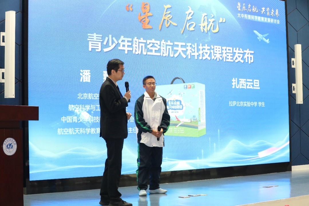 开幕式上,中国科学院原党组副书记兼中国科学技术大学原党委书记、研究员、国际欧亚科学院院士郭传杰,携手北京航空航天大学实验学校的学生共同宣读《百位航空航天科学家进百校倡议书》;中国青少年科技教育工作者协会航空航天科学教育专业委员会主任、北京航空航天大学航空科学与工程学院院长潘翀与来自西藏拉萨北京实验中学的学生扎西云丹,共同启动了“星辰启航”青少年航空航天科技课程。