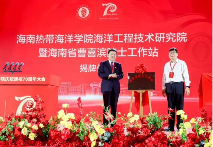 大会现场,中国工程院院士曹喜滨和陈锐共同为海南热带海洋学院海洋工程技术研究院暨海南省曹喜滨院士工作站揭牌。