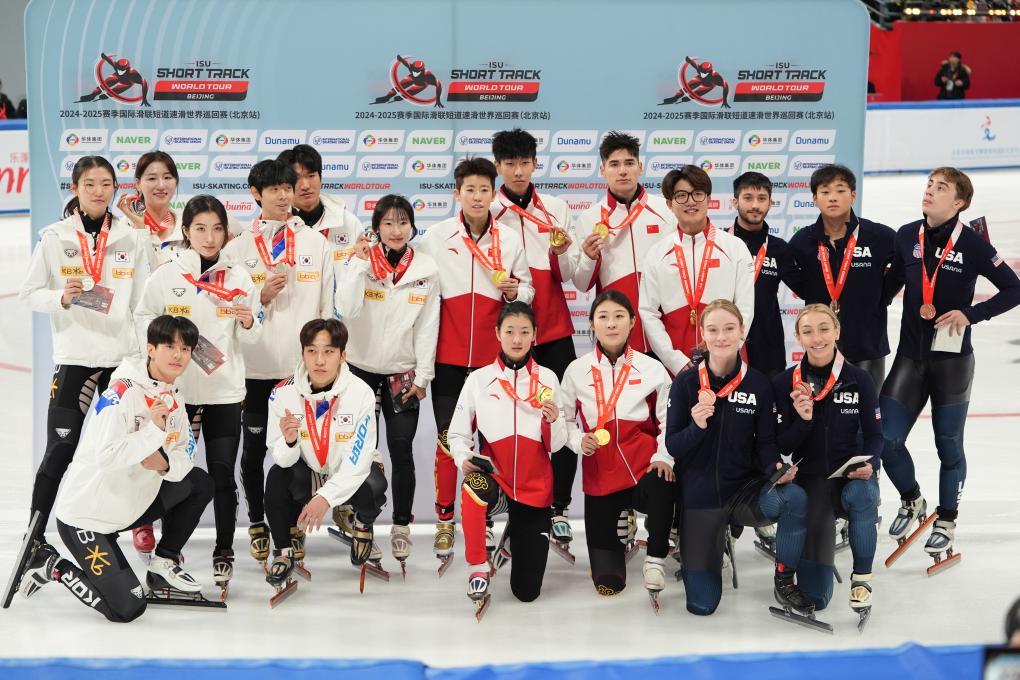 2024-2025赛季国际滑联短道速滑世界巡回赛北京站8日在首都体育馆决出最后五项冠军,中国队夺得混合团体接力和男子5000米接力两枚金牌。