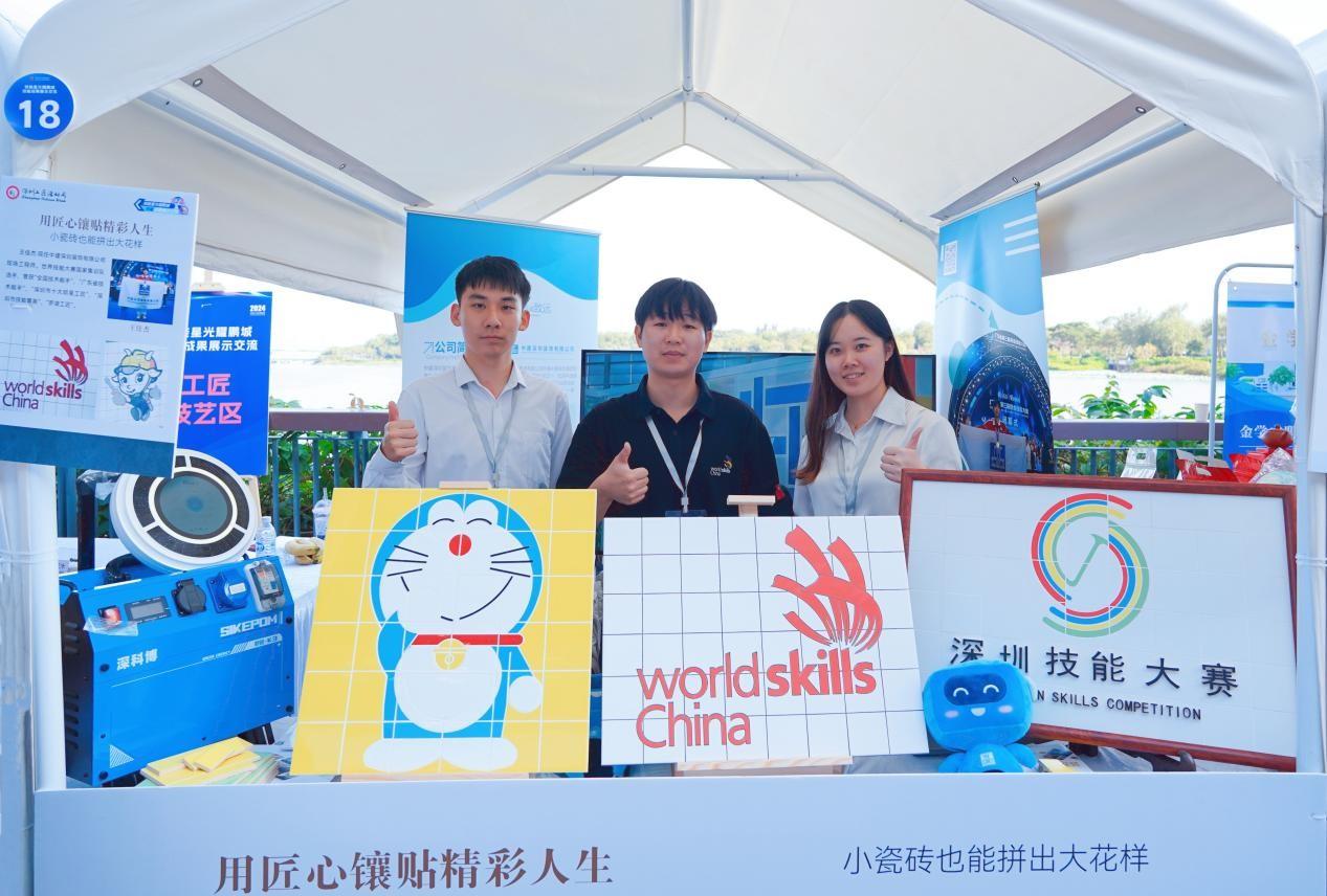 活动现场,广东省技术能手、中建深圳装饰有限公司(以下简称中建深装)王佳杰展示了薄贴工艺和复杂拼接技艺,复杂造型瓷砖在他手下精准切割且边缘光滑平整,拼接处无缝咬合。