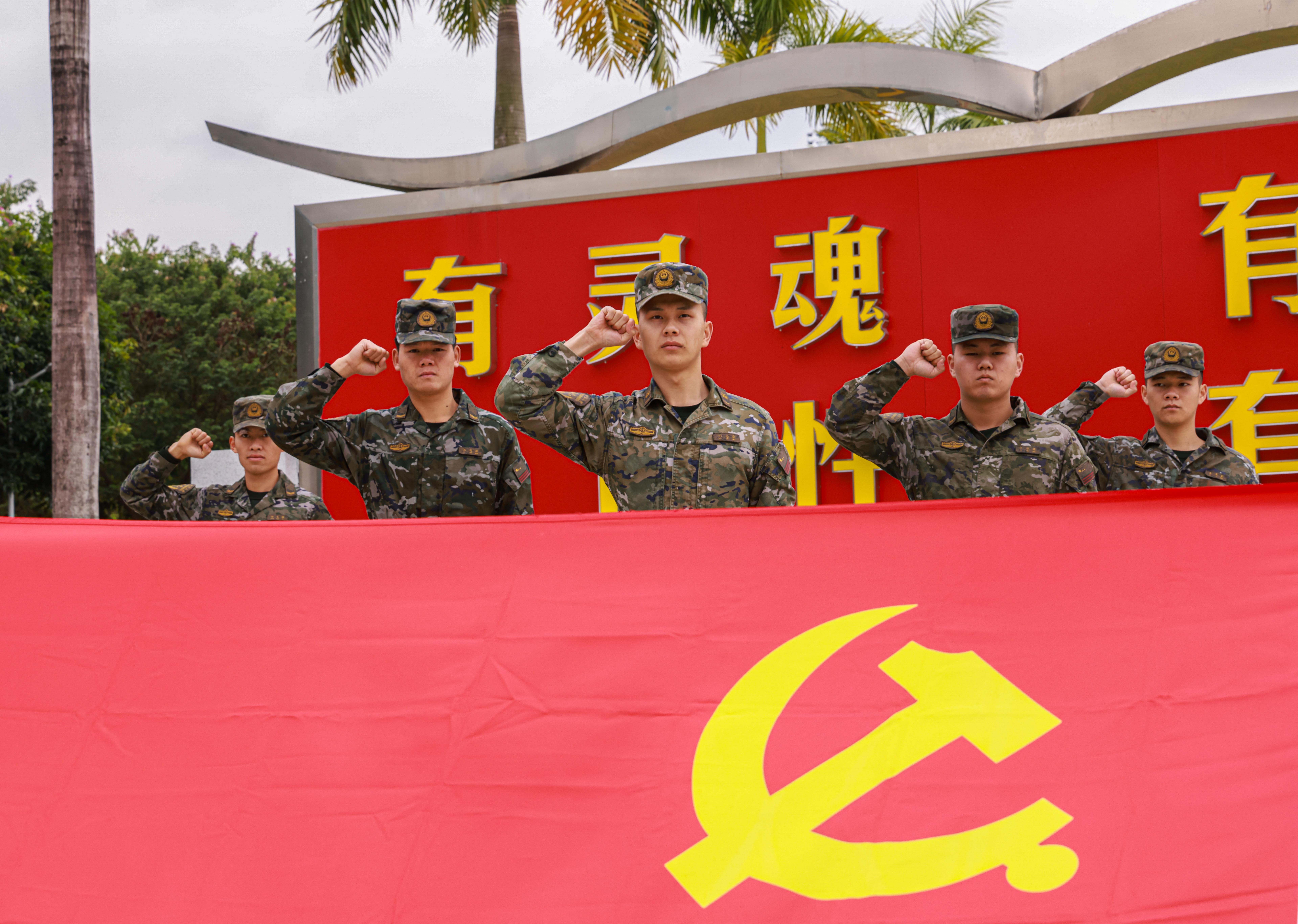 在警勤中队,官兵们面对庄严鲜艳的党旗,高举右拳,高声立誓。