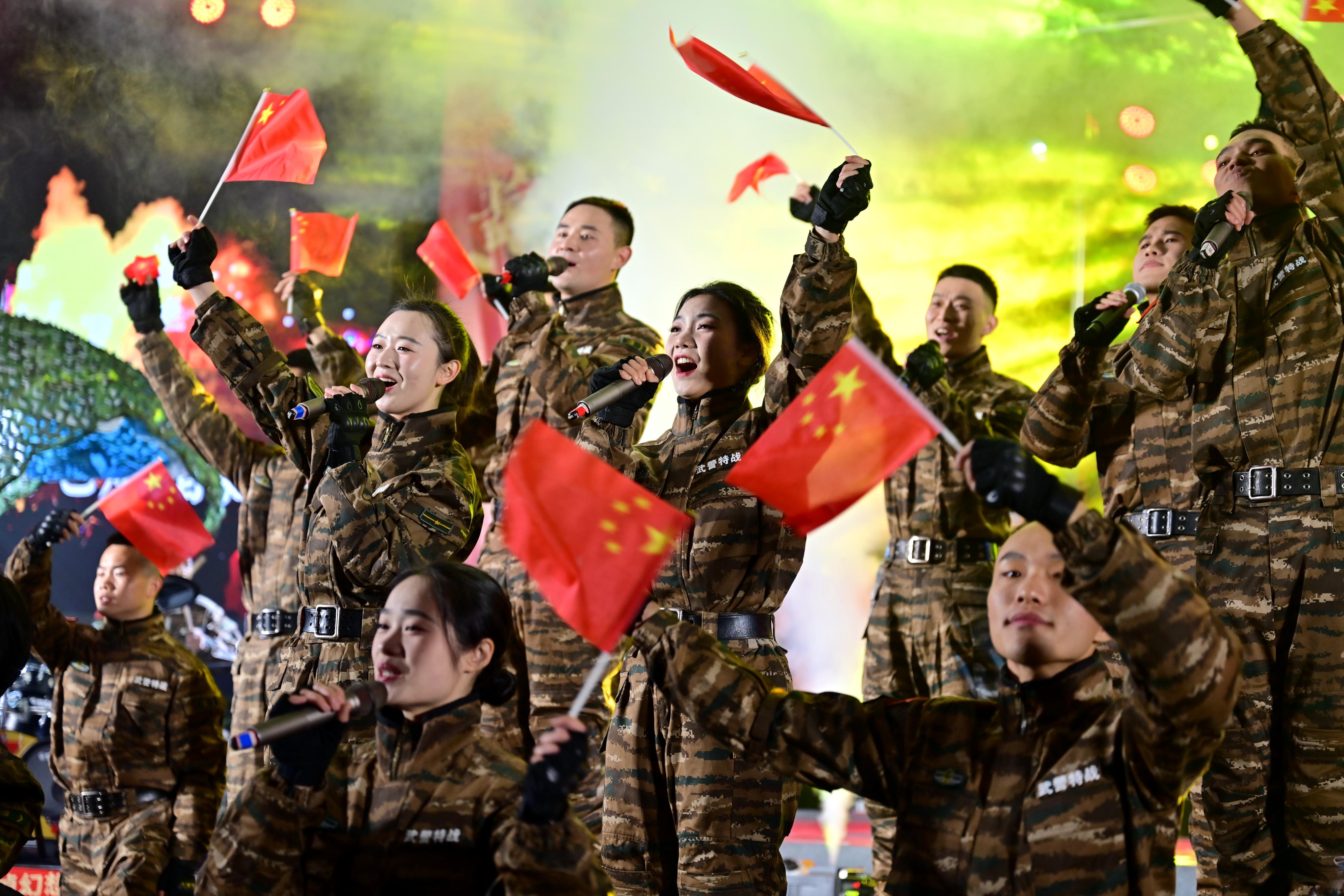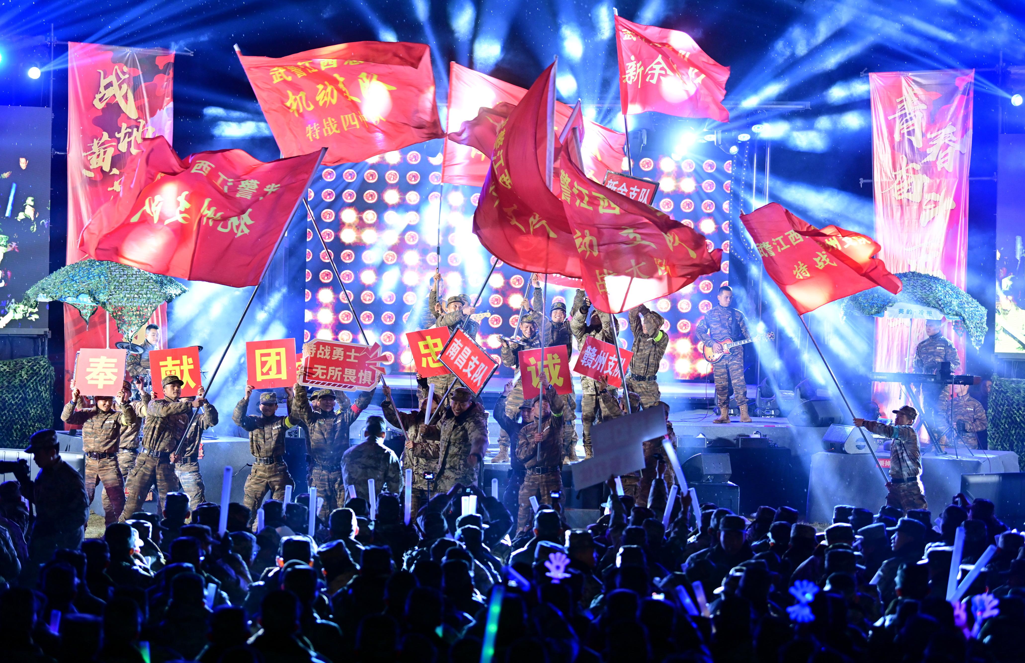 “演出即将落幕,强军的号角早已吹响。聚集在井冈山下,驻守在这片红土地,让我们共同歌唱血脉里永不褪色的赤诚:我爱你,中国!”在歌曲《我爱你中国》的旋律中,主持人宣布演出结束,现场官兵齐声高唱,歌声在空中久久回荡。