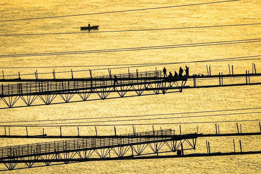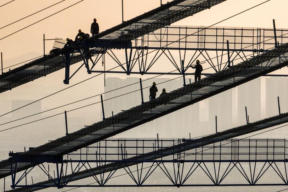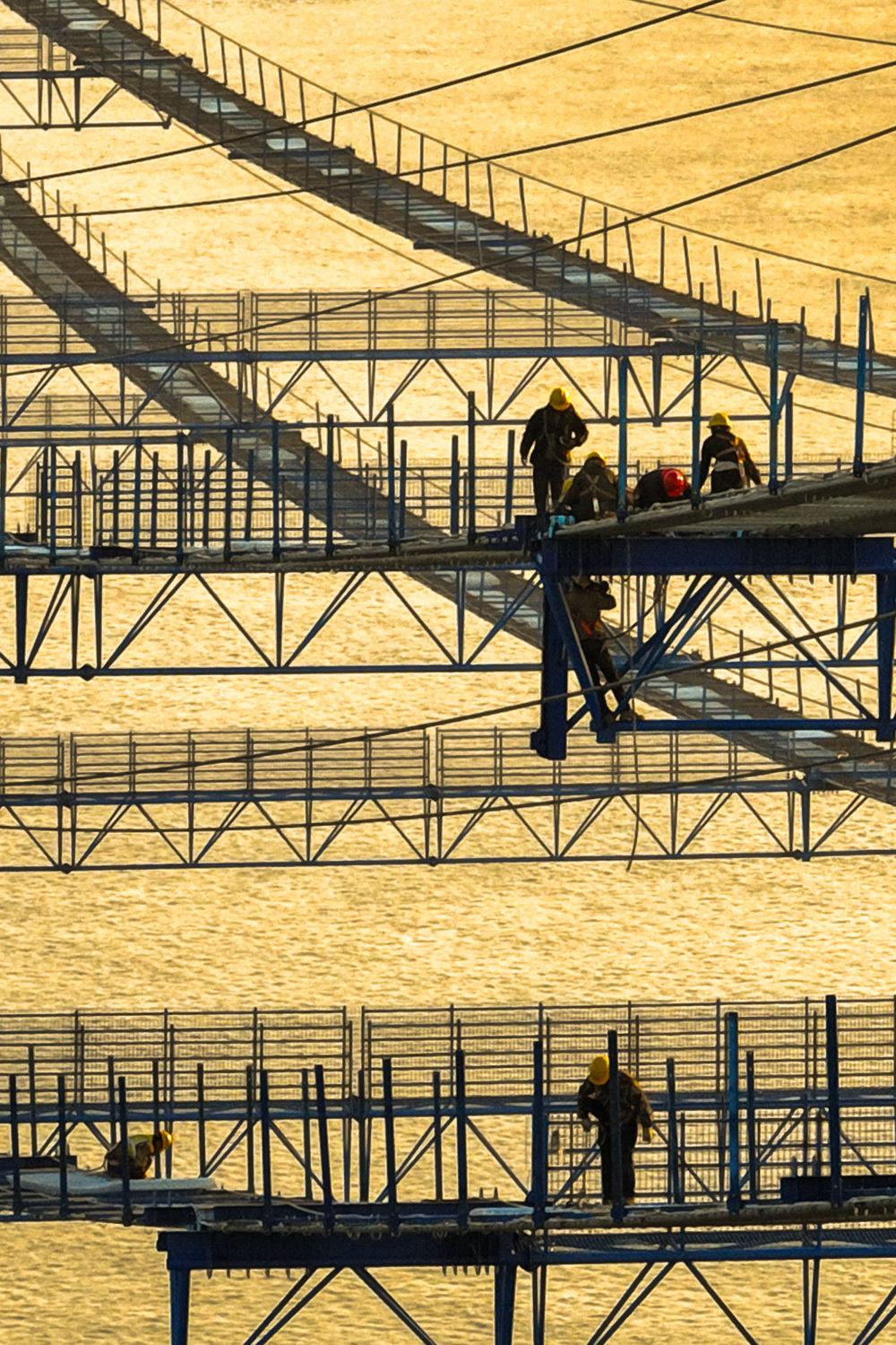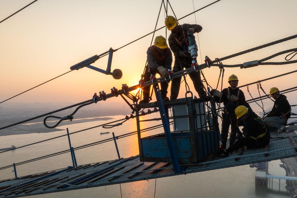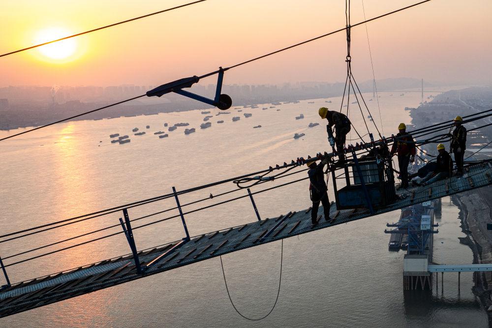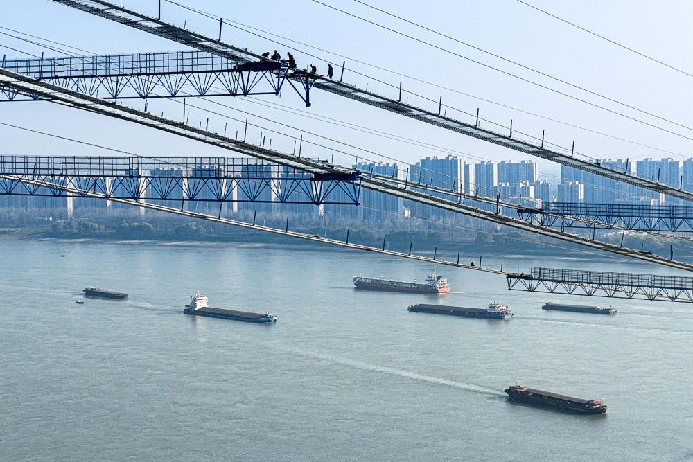 近日,在燕矶长江大桥的猫道面网铺设施工现场,建筑工人在距离江面近200米的高空作业,伴着脚下的长江波涛,稳步推进工程建设。
