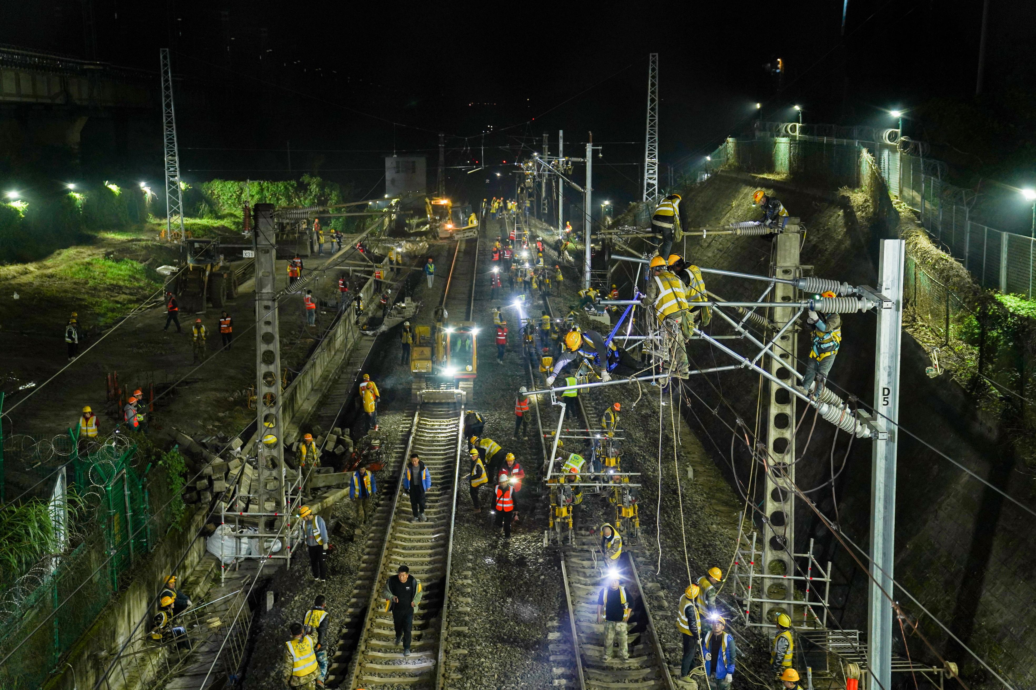 12月17日23点30分,拨接施工正式开始,来自中铁五局、重庆工电段、成都电务维修段等多家单位,700余名施工人员、30余台套机械设备,按照既定方案组织实施。施工中,拆除线路、起道、拨道、捣固、钢轨接头焊接、机车压道等工序衔接自如。经过270分钟紧张有序的作业,施工人员拆除1组18号单开道岔,整修拨移线路250米,完成重庆枢纽相关站后四电及信号倒替等工作,使渝怀铁路井口至重庆北间恢复双线运输能力。