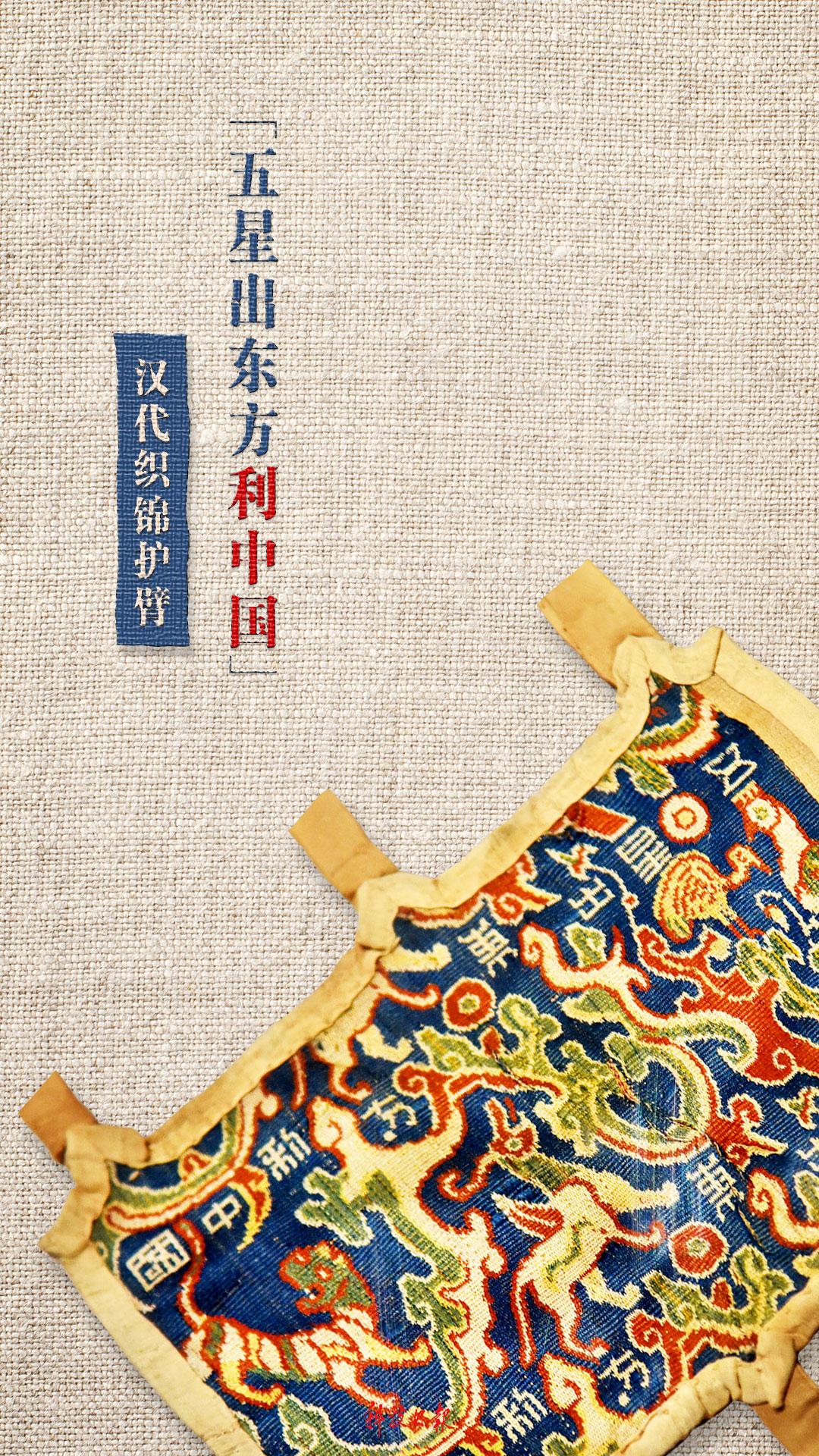 五星出东方利中国,此织锦作为极具象征意味的文化标识,成为中华民族文化传承中极为耀眼的标志性符号。绣着这句织文的汉代织锦护臂于1995年在新疆民丰县尼雅遗址发现。这件文物以红、黄、蓝、白、绿五彩丝线织就,自右至左依次织有凤凰、鸾鸟、麒麟、白虎等吉禽瑞兽。