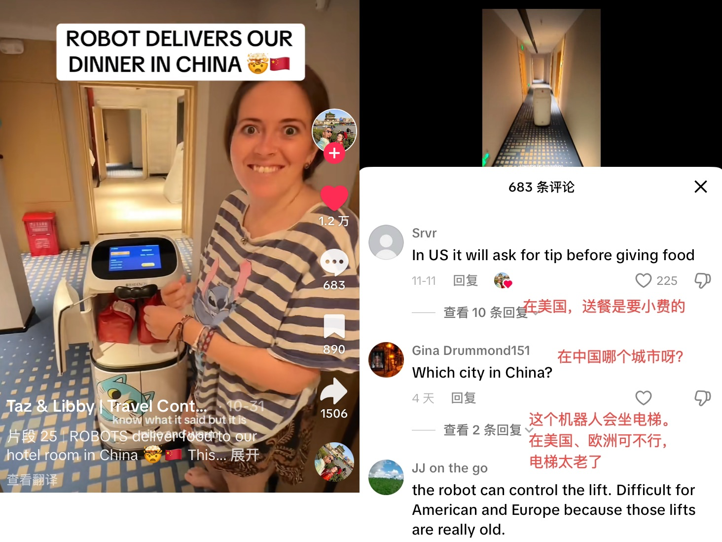 英国夫妇Taz和Libby在TikTok上分享了一段独特的住酒店经历。“你们能想象到吗?中国的机器人可以把晚餐送到我的房门!”他俩拍下了机器人送餐的全过程,一边吃烤鸭一边“炫耀”地问:“太疯狂了,你们之前见过吗?”