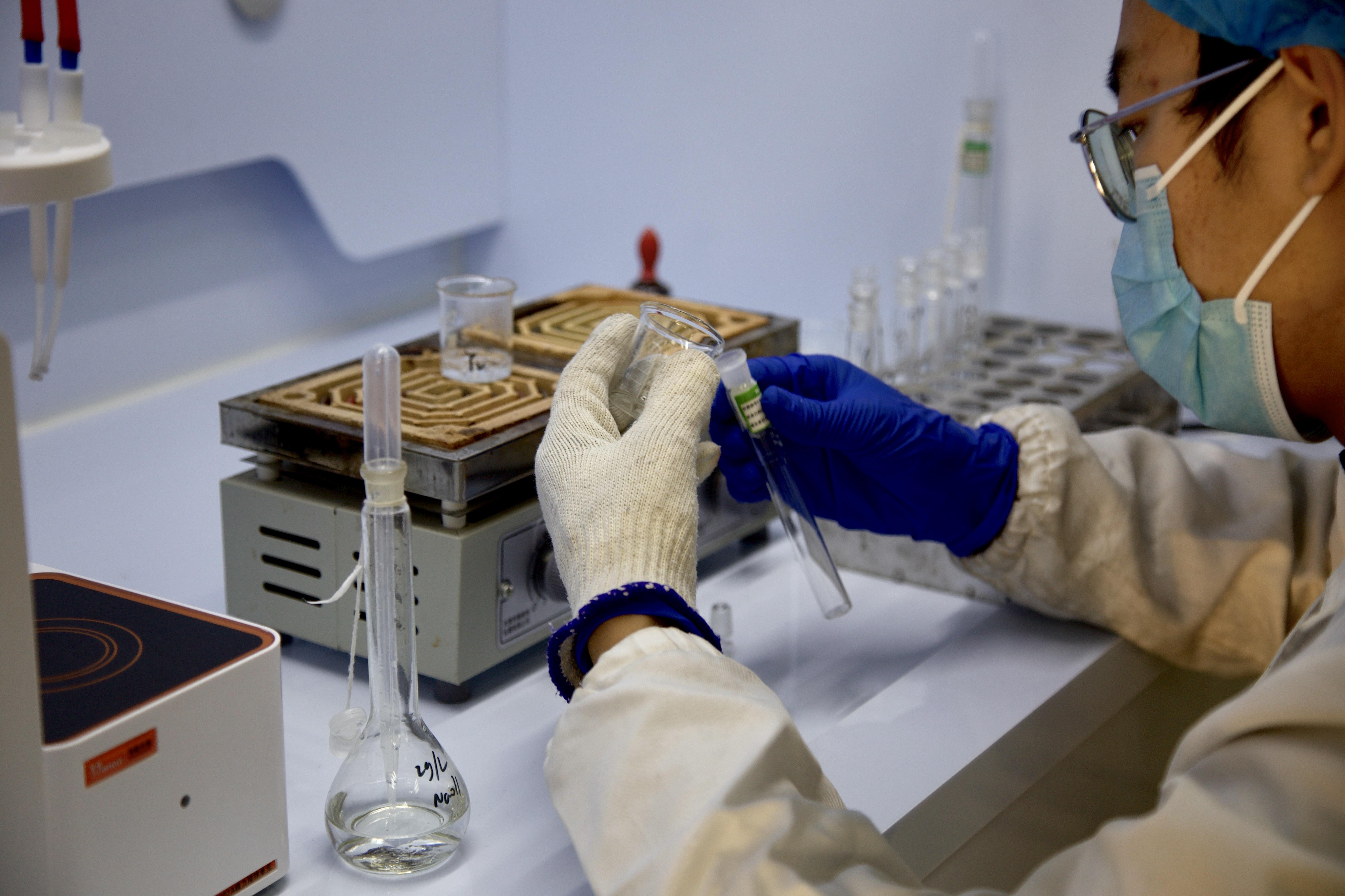 得益于先进的设备和技术手段,工作人员只需将生猪、面点、油脂等食材提取物,在蓝色、红色的试剂液体中搅拌、加热,其中的微生物含量、新鲜度、酸度、能量、脂肪等就能很快测算出来。