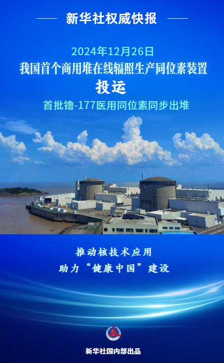 12月26日,我国首个商用堆在线辐照生产同位素装置在中核集团秦山核电基地正式投运,在此生产的首批镥-177医用同位素也同步出堆。这对助力“健康中国”建设、推动我国核技术应用具有深远意义。