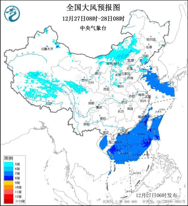 预计,12月27日08时至28日08时,内蒙古中部、宁夏、山西、河北北部、北京西部、天津、新疆沿天山地区、青海南部、西藏中北部、辽东半岛、山东半岛等地部分地区有5~6级风、阵风7~8级,其中,河北北部、西藏中北部等地局地阵风9级;渤海、渤海海峡、黄海大部海域、东海北部海域、台湾海峡、台湾以东洋面、巴士海峡、南海大部海域、北部湾将有7~8级、阵风9~10级的大风。