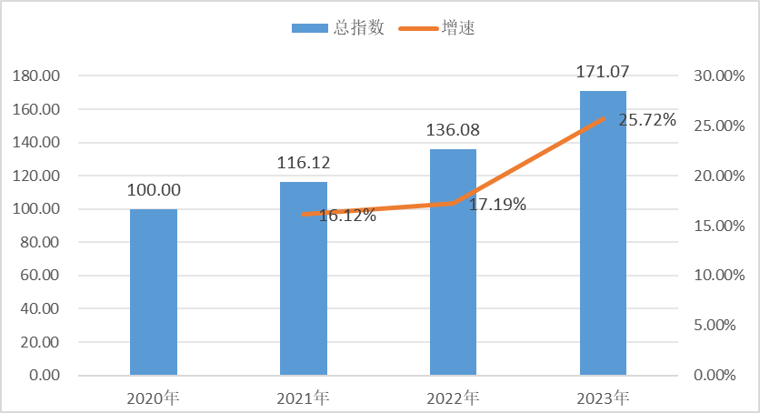 从指数增长情况看,2020—2023年浙江科技成果转化总指数历年增幅均超过16%,年均增长率达到19.60%,2023年浙江科技成果转化指数同比增长25.72%,增速逐年加快,说明浙江省科技成果转化步伐加快,为全省经济的高质量发展注入强劲动力。