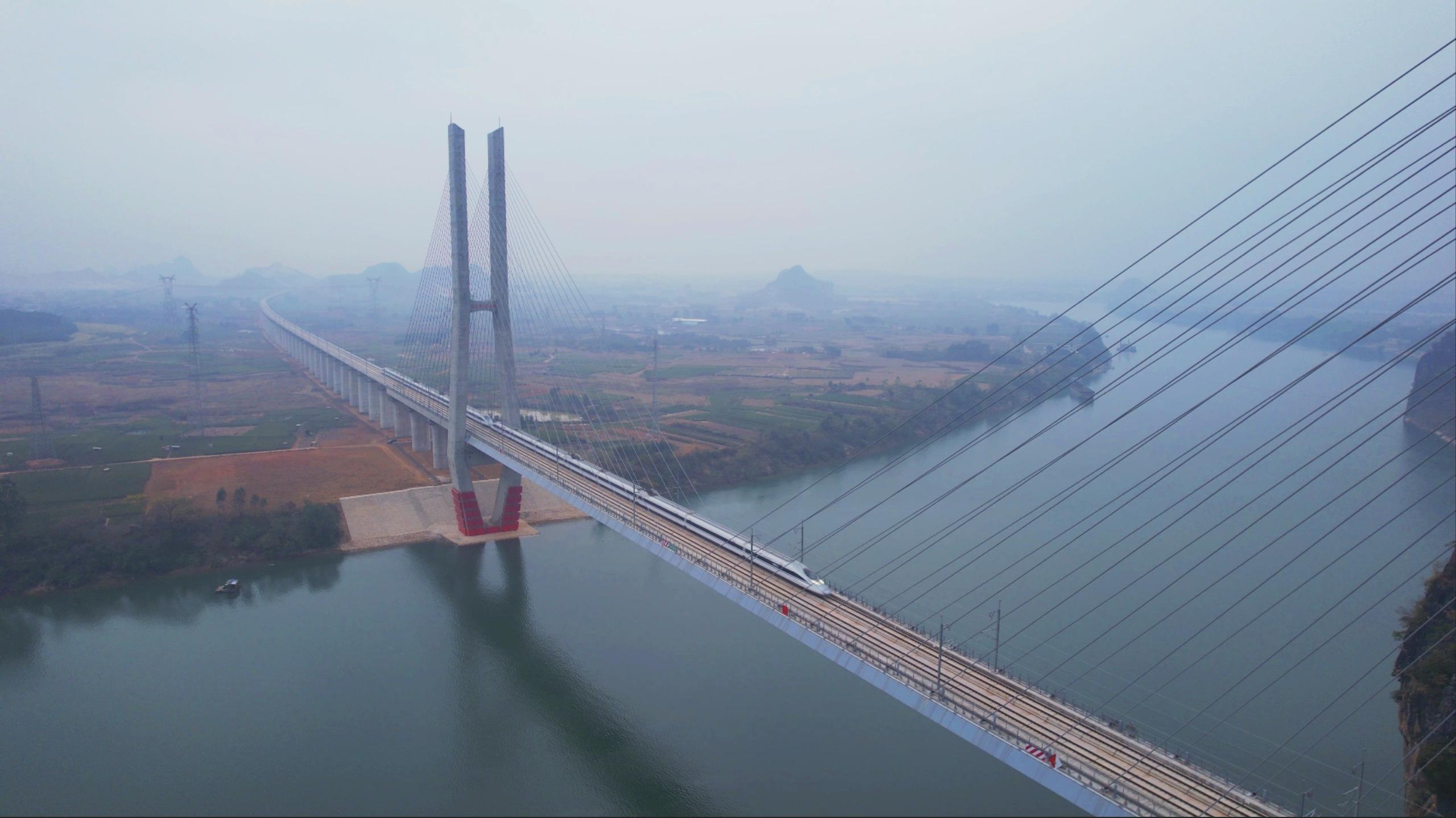 “为此,建设过程中我们注重推动新技术的应用和创新体系建设,加大智能设备应用和创新,其中自主研发国内首台千吨级智能悬臂造桥机,创新钢梁吊装三维精调装置,实现320米跨江桥梁‘毫米级’合龙精度。”广西南玉铁路有限公司工程部副部长曹献良说。