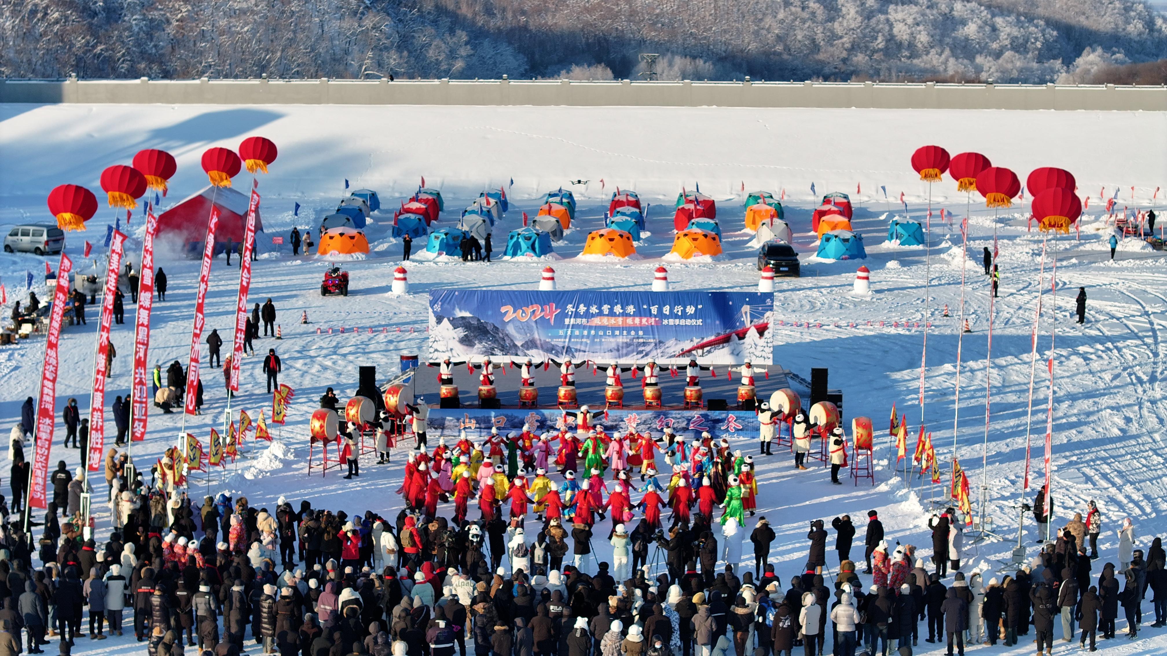 12月30日,黑龙江省黑河市启动冰雪旅游“百日行动”暨“极境冰雪 蝶舞黑河”冰雪季。在启动仪式主会场——五大连池市山口湖风景区,雾凇美景、奇幻漂流、冬捕冰钓、冰帐火锅等系列特色活动,为游客呈现了一场冬季冰雪盛宴。