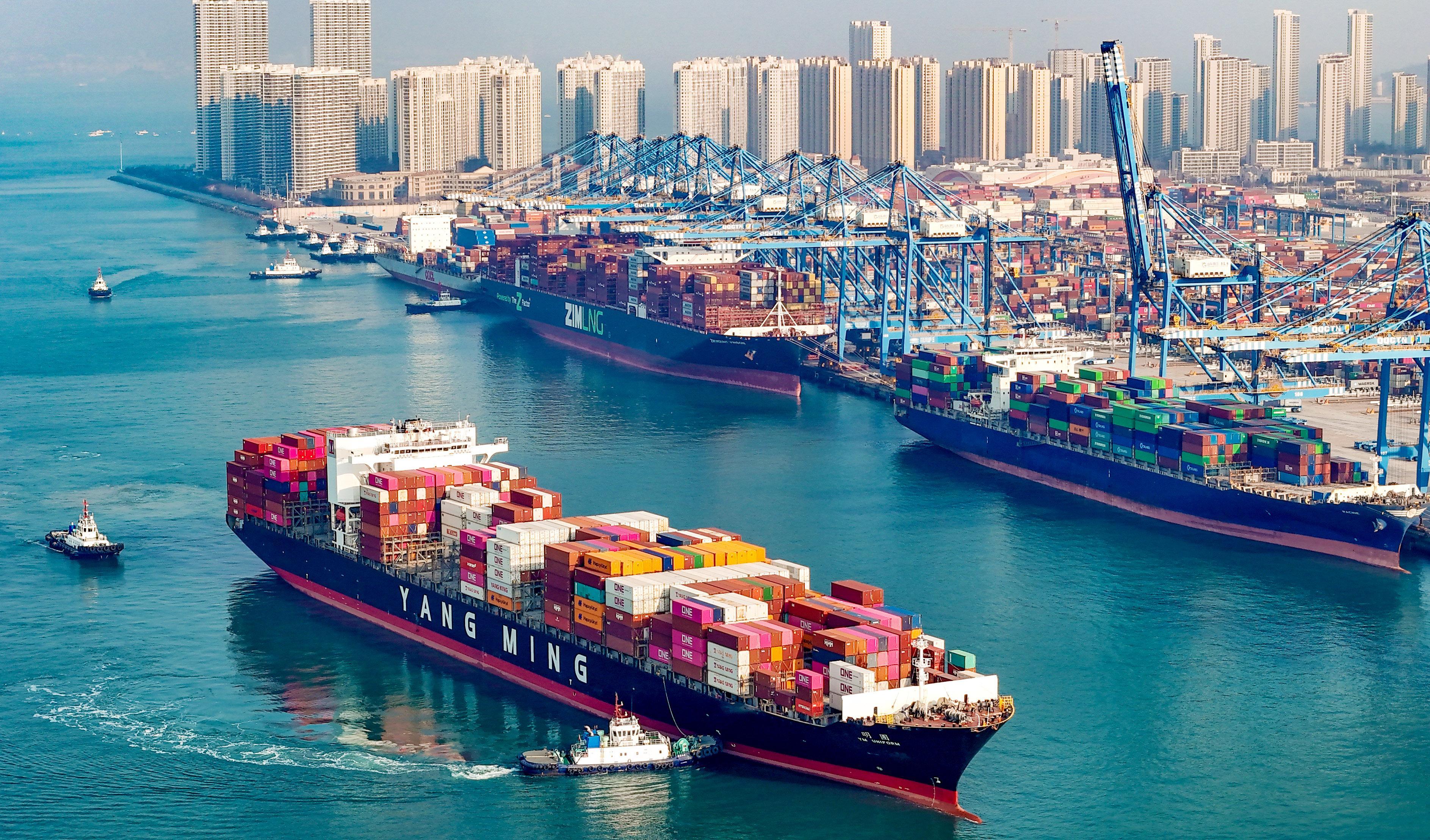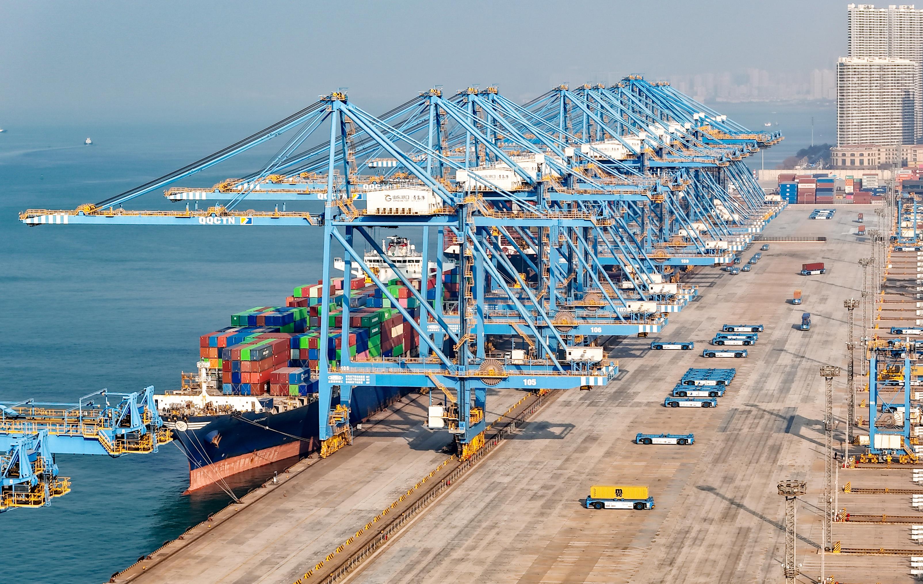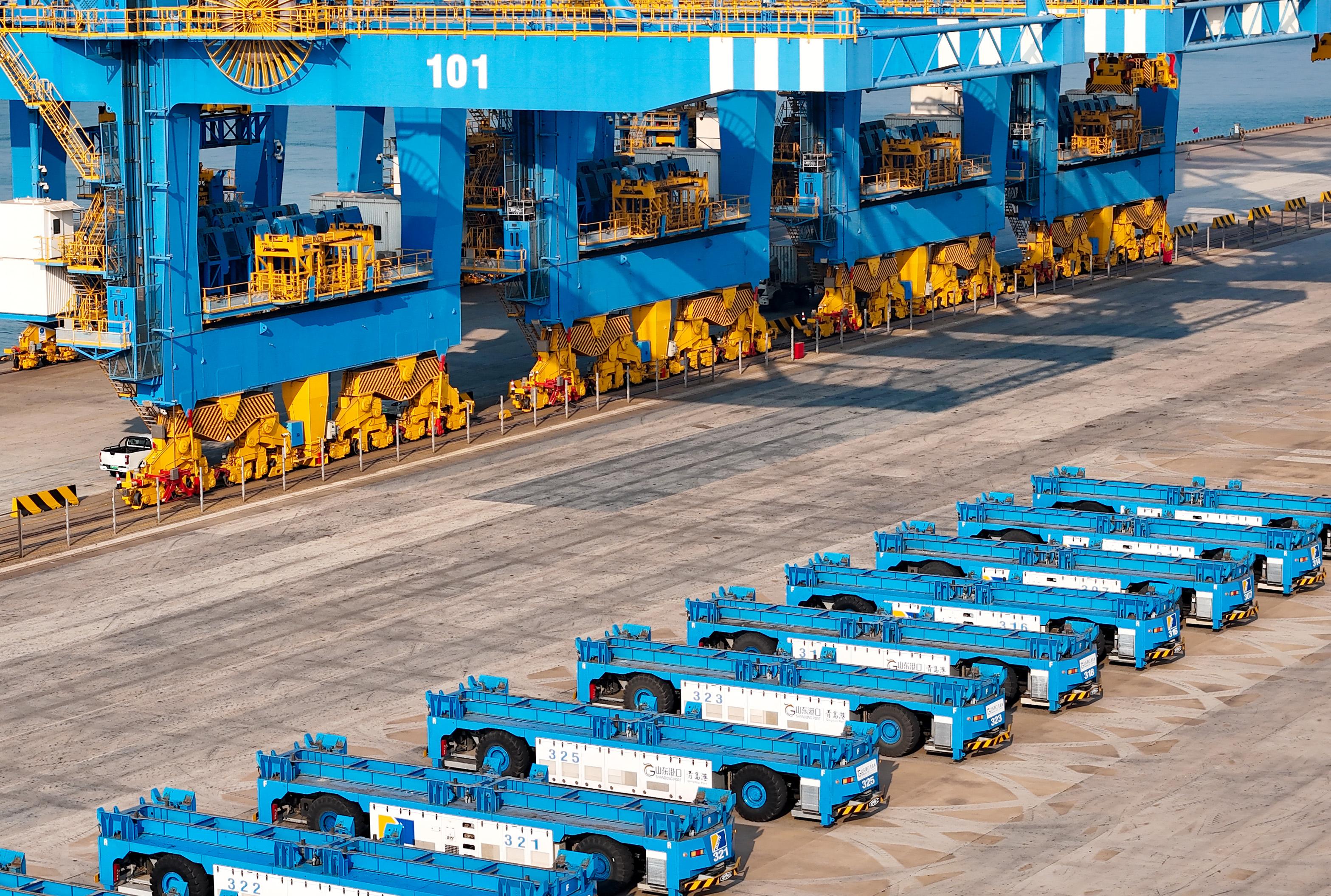 1月1日,在位于山东自贸试验区青岛片区的山东港口青岛港全自动化码头,自动导引车有序运送货物,高速轨道吊在集装箱堆场来回穿梭,货轮有进有出一派繁忙。
