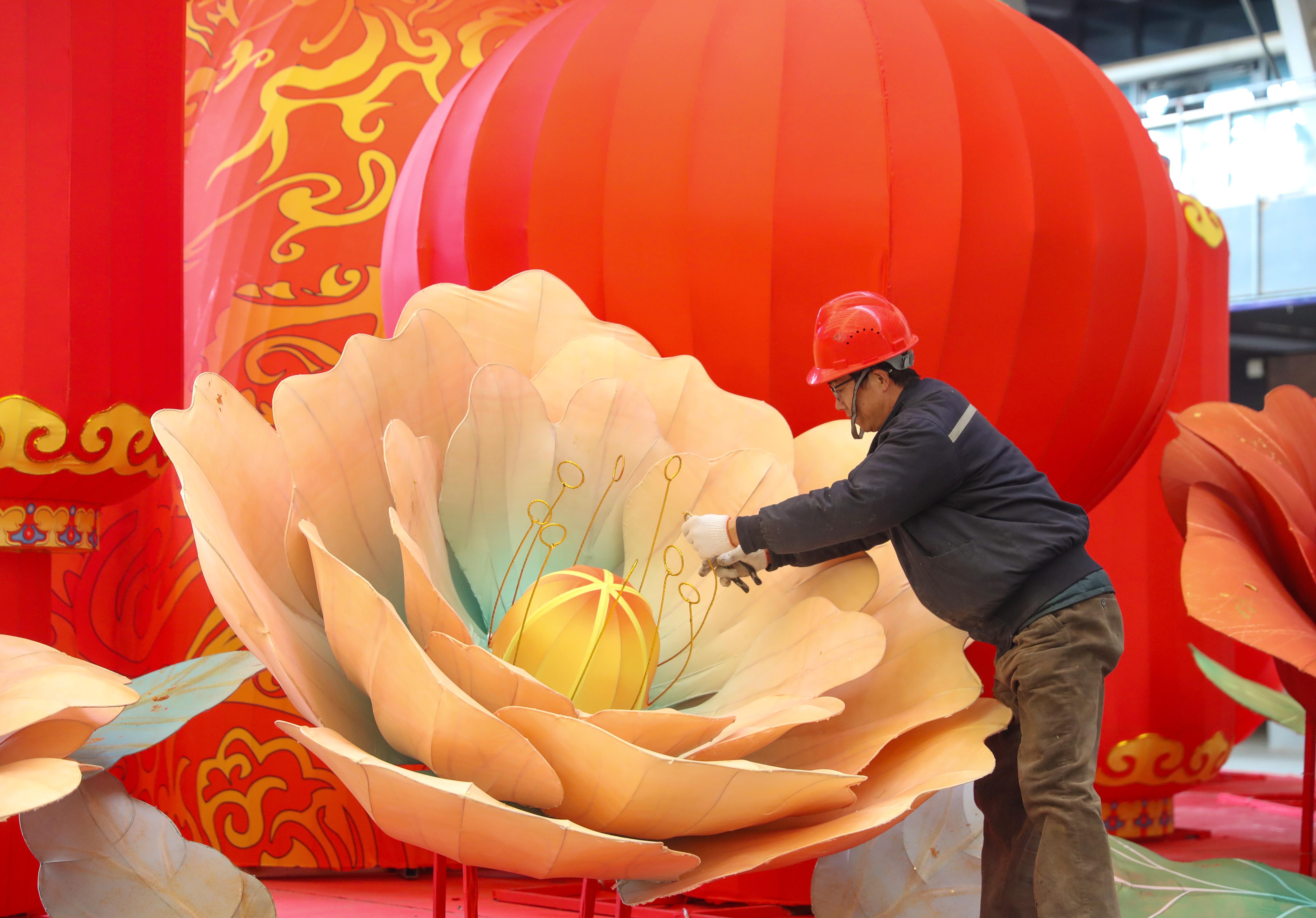 1月4日,在青岛西海岸新区中铁世界博览城,来自四川自贡市的150余名花灯工匠在紧张地制作和组装灯组,为青岛新春艺术彩灯节做准备。