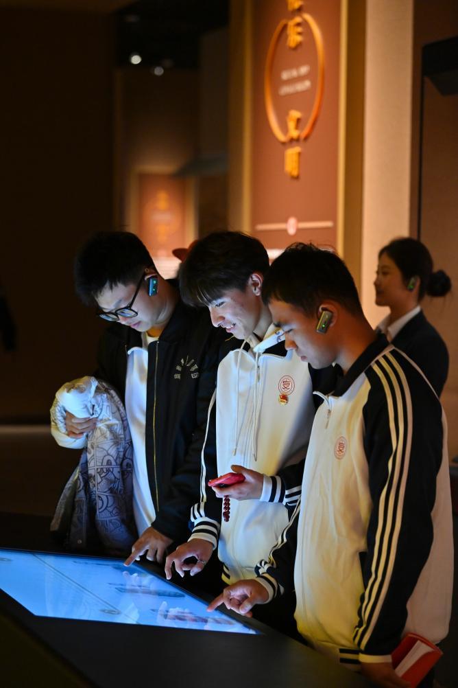 进入沉浸式数字展厅,陶寺城的生活画卷在游客张泽豪身边展开:被城墙环绕的大城在晨曦中醒来,宫城里“王”在处理政务,乐师们敲鼓击磬,艺人在作坊区绘制陶器,农民在田地里迎来粟黍丰收……“有种穿越感,在轻松氛围中就对陶寺文明有了全面了解。”他说。