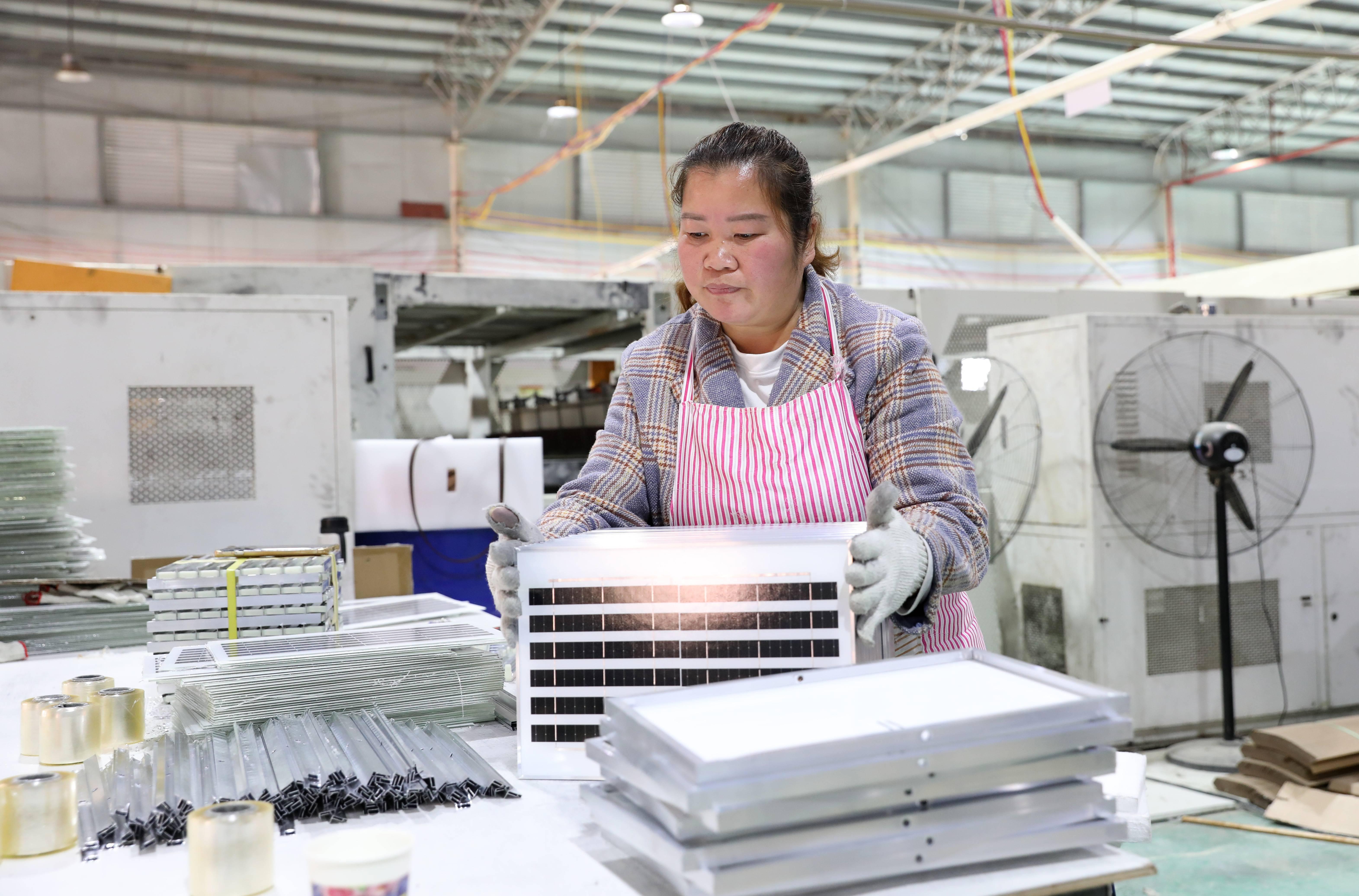 近日,工人们在广西三江侗族自治县古宜镇南站社区广西贵光新能源科技有限公司车间内加工生产光伏板,全力抓生产、赶订单、抢开局,奋力实现新年“开门红”。