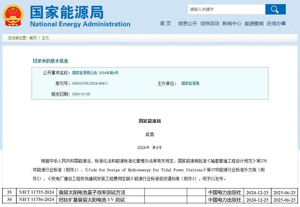 近日,国家能源局发布2024年第4号公告,由隆基绿能科技股份有限公司(以下简称隆基绿能)主导制定的两项能源行业标准《叠层太阳电池量子效率测试方法》(NB/T 11735-2024)、《钙钛矿基叠层太阳电池I-V测试》(NB/T 11736-2024)获批发布,并将于2025年6月25日实施。