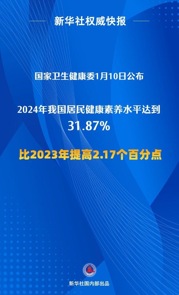 记者1月10日从国家卫生健康委了解到,2024年我国居民健康素养水平达到31.87%,比2023年提高2.17个百分点。