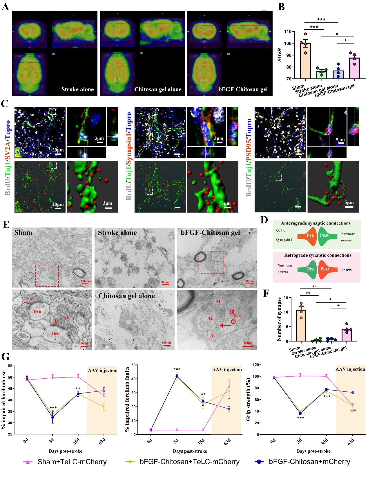 研究人员将bFGF-壳聚糖凝胶注射入卒中腔内,促进了卒中腔内血管内皮细胞增殖,新生血管形成功能性血管网络,最终导致卒中腔内脑血流的恢复。同时,该凝胶可促进SVZ区神经干/祖细胞的活化,募集其迁移至卒中腔,并分化为具有不同类型且具有脑皮层特异性的成熟神经元。这些新生神经元与宿主脑组织形成了功能性的神经环路。