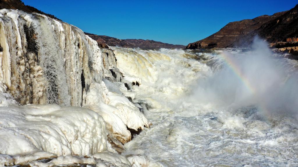 站在壶口瀑布岸边,只见往日奔腾咆哮的壶口瀑布落差逐渐变小,只有不到10米,大量堆积的流凌横跨黄河两岸,宛若一条白色苍龙蜿蜒盘旋在晋陕峡谷之间。
