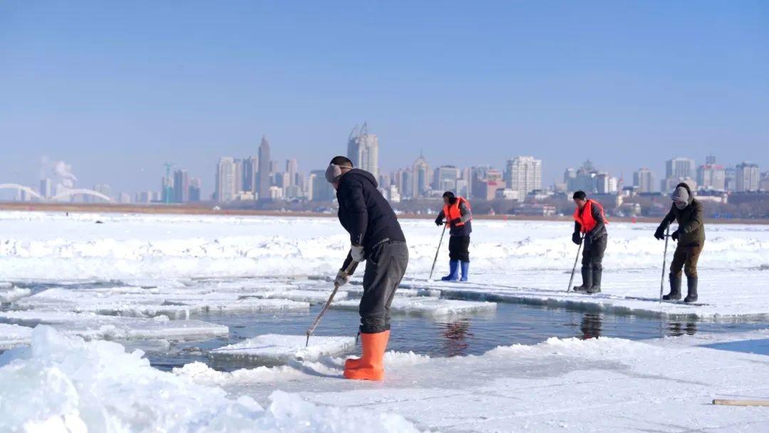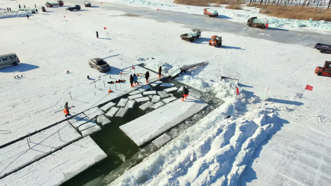 采冰的第一道工序是在坚实的冰层上拉线、量距离,用冰锯进行划线切割。伴着冰锯的轰鸣和飞扬的冰屑,一个个冰块的轮廓整齐布满江面,断冰工们用冰镩凿击冰面,将冰块从大冰排上分离开。断好的冰每块都有几百斤重,采冰工人喊着号子一起发力,将冰块拉出江面。