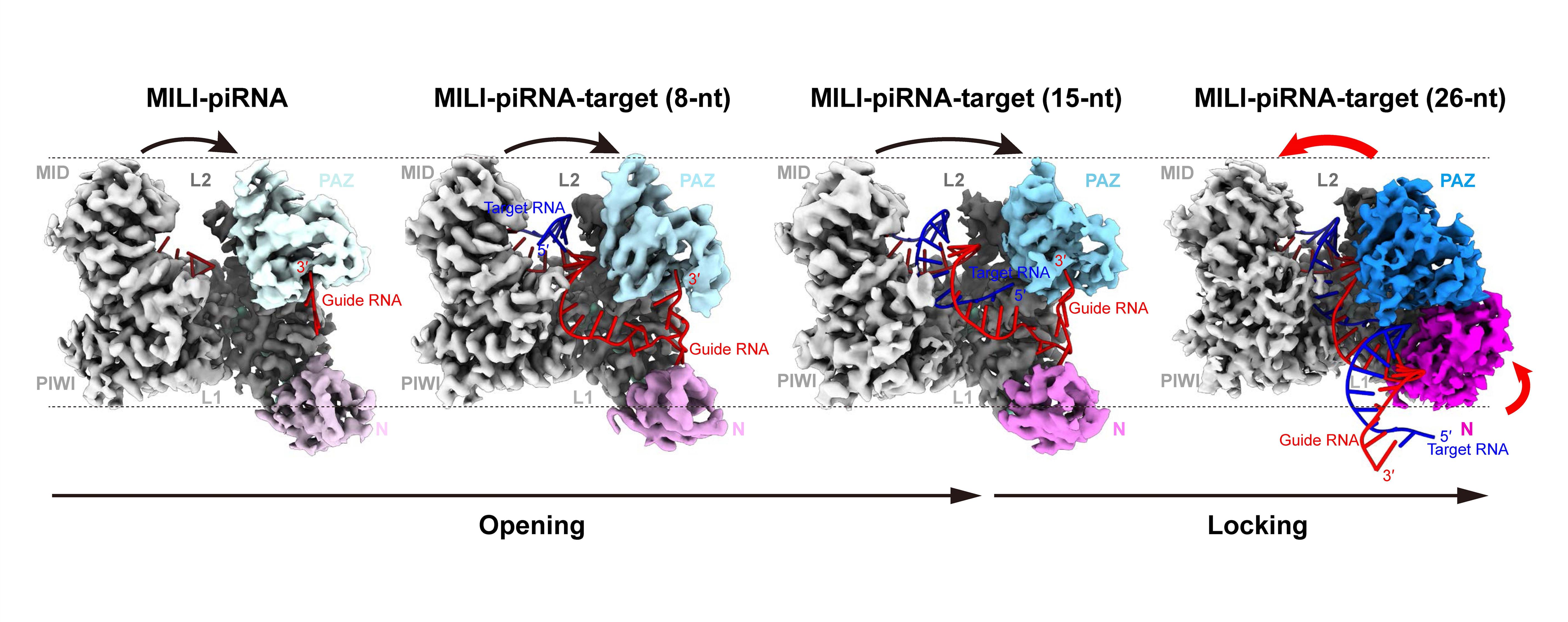 研究团队首先获取了PIWI-piRNA二元复合物,然后让其与不同长度的靶标RNA结合,通过分步观察的方式,深入研究复合物的结构变化。他们运用先进的技术手段,成功识别出了PIWI蛋白的开放、中间、关闭三种过渡状态。这三种状态就如同一只手在抓取物体时,先张开(开放状态),然后逐渐握住目标(中间状态),最后完成切割(关闭状态)。同时,研究团队还成功鉴定出新的RNA切割催化中心关键位点。