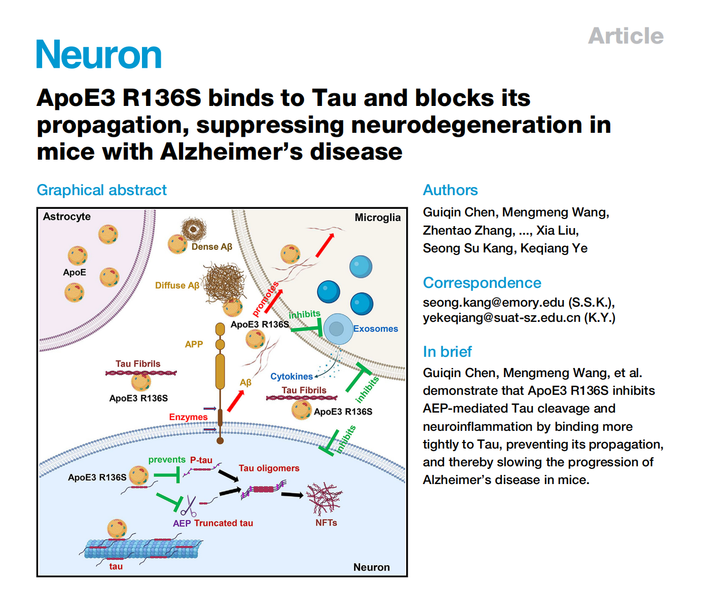 1月16日,记者从深圳理工大学获悉,该校生命健康学院讲席教授叶克强团队研究发现,大脑里的一种突变基因(ApoE3 R136S)通过阻断微管相关蛋白(Tau)的传播,可进而发挥延缓阿尔茨海默病患者病程的保护机制,或将为阿尔茨海默病治疗带来新方法。相关研究成果发表在《神经元》上。