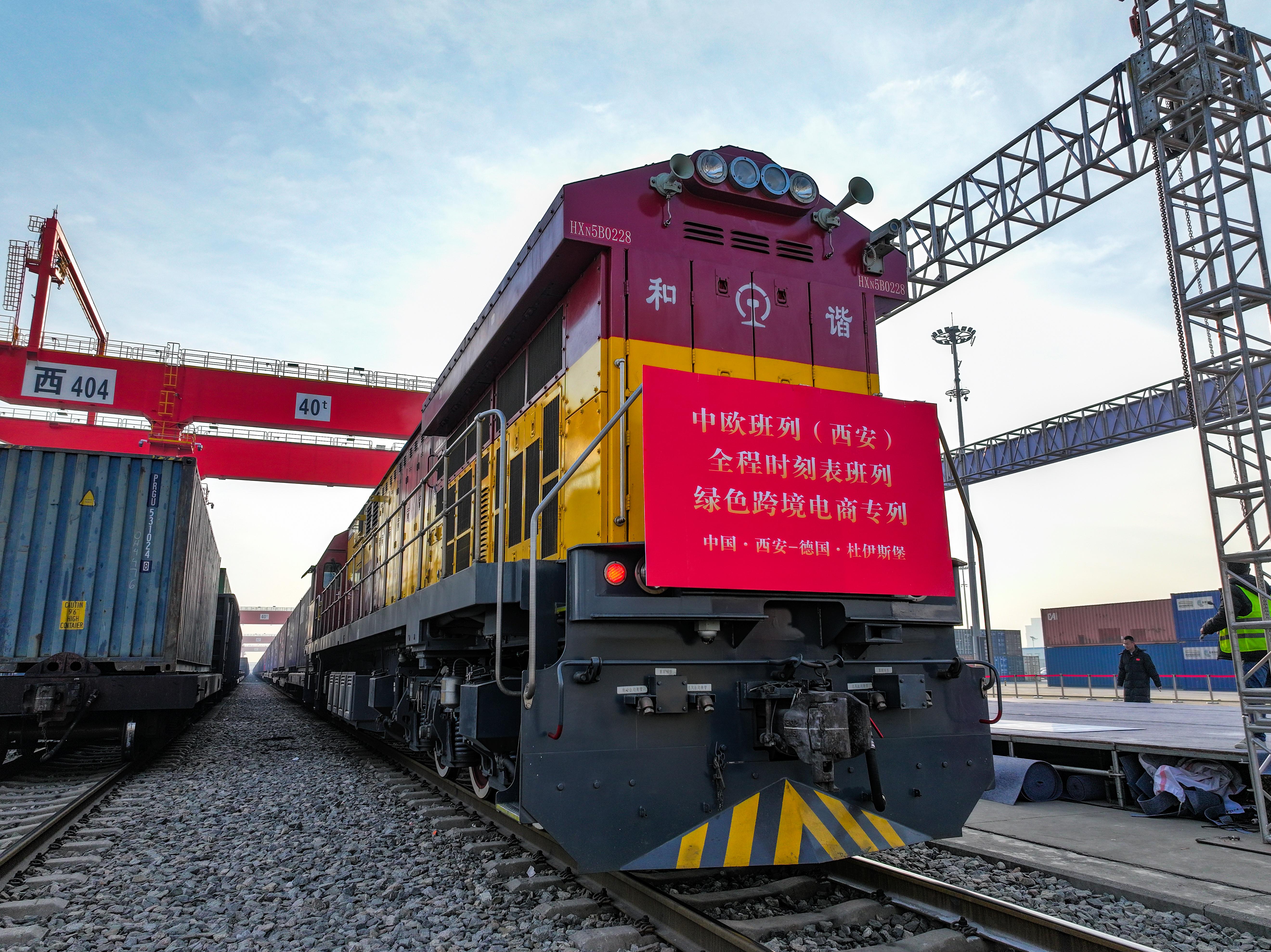1月17日,全国首列全程时刻表班列绿色跨境电商专列在西安国际港站鸣笛发车,一路向西,驶向德国杜伊斯堡。此次开行的班列,将绿色班列与中欧班列(西安)全程时刻表班列相结合,进一步拓宽跨境电商物流方案,为中国产品出海开辟了新通道。