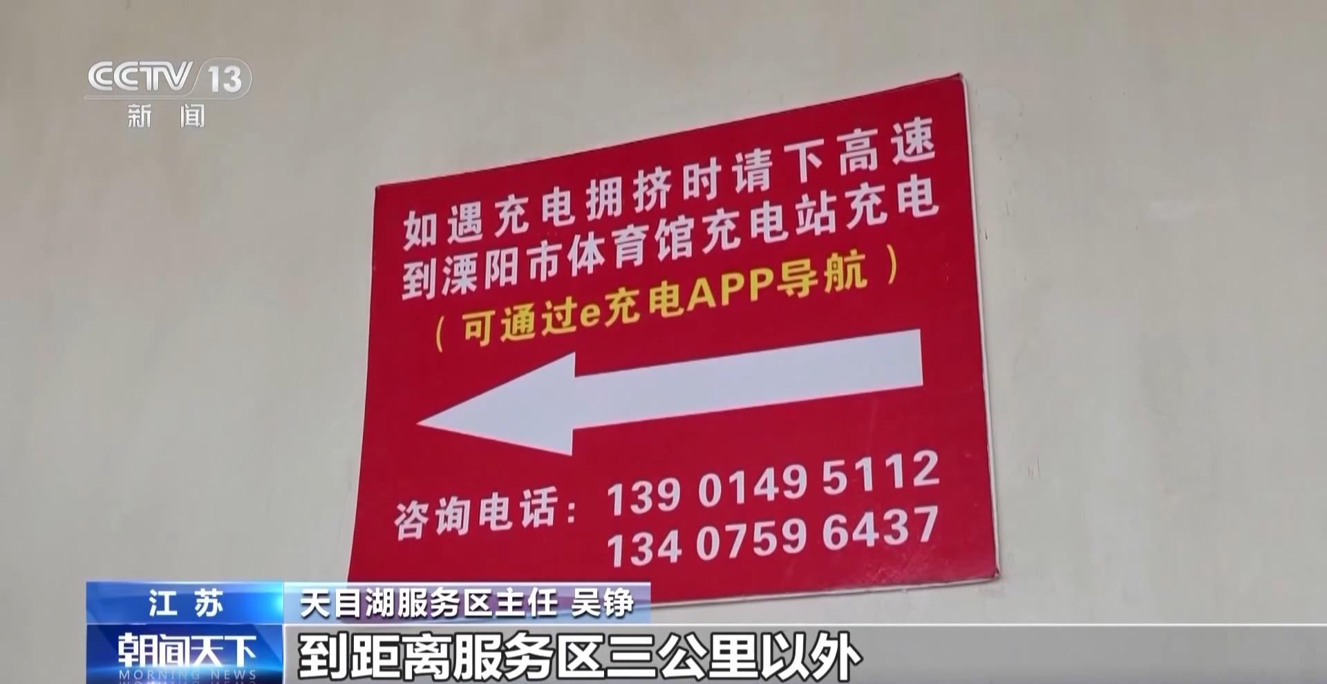 天目湖服务区主任 吴铮:我们张贴了提醒标志,如遇车辆充电拥堵时,我们建议司乘人员就近下高速到距离服务区三公里以外进行公共区域充电。