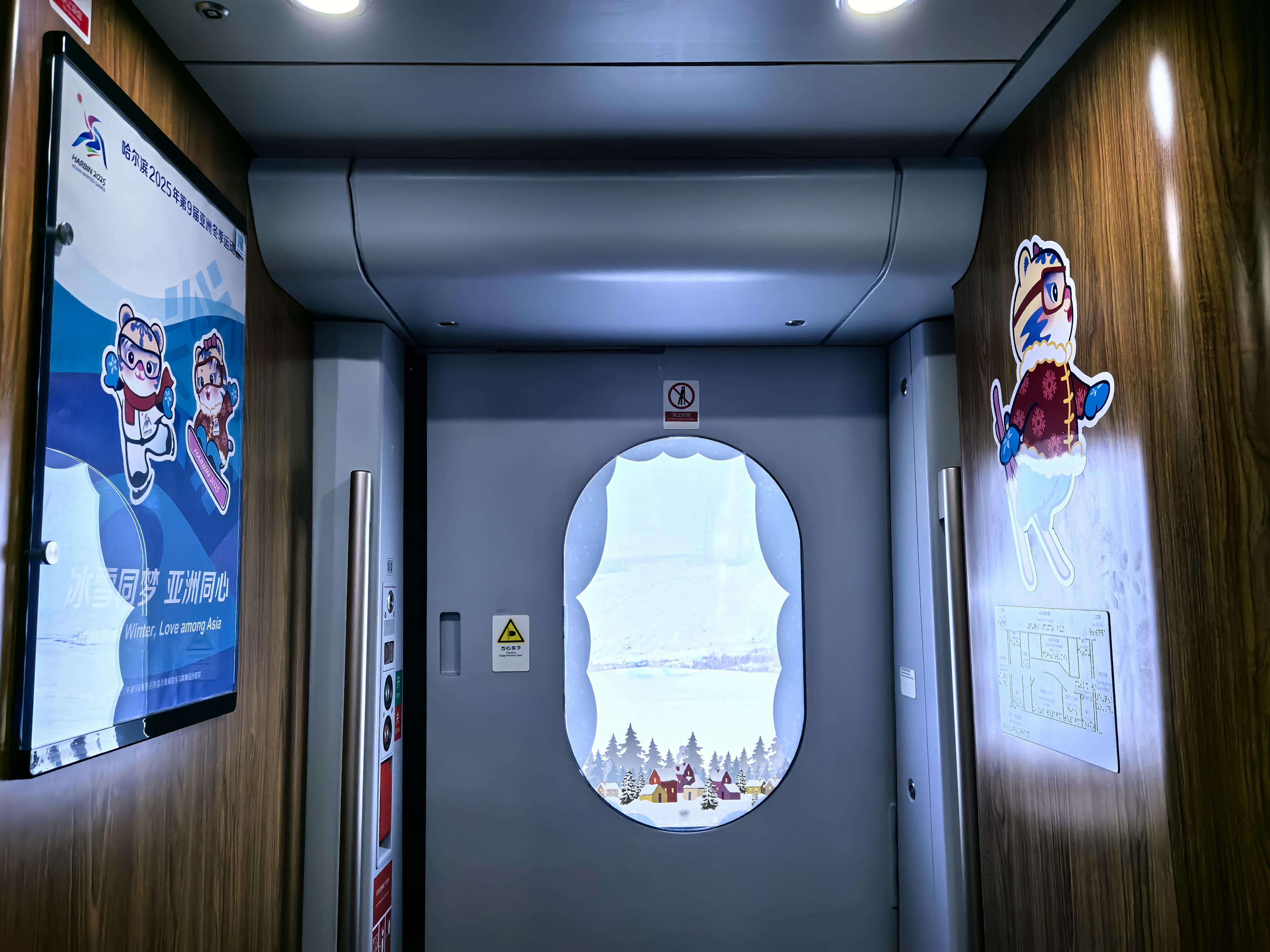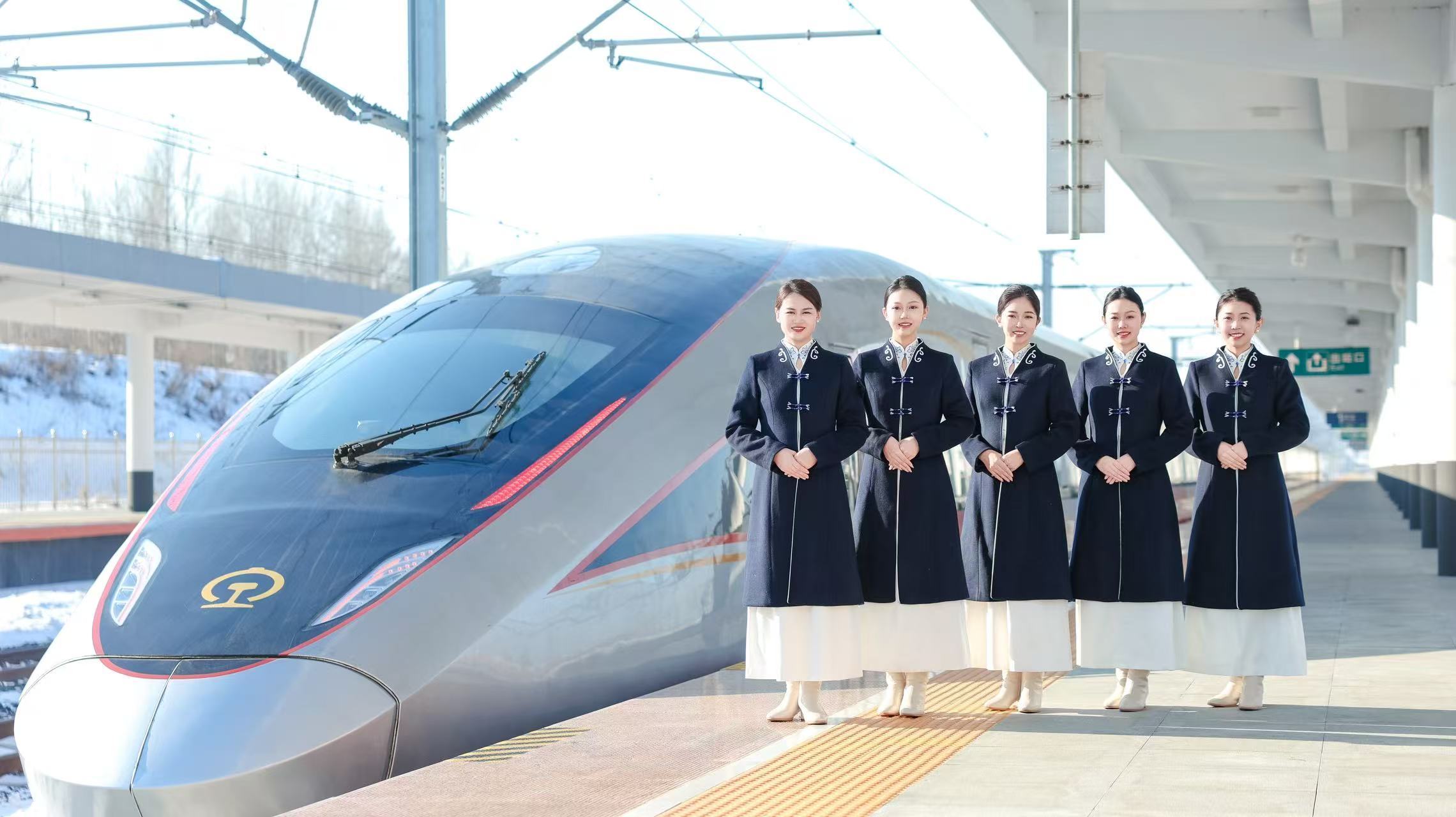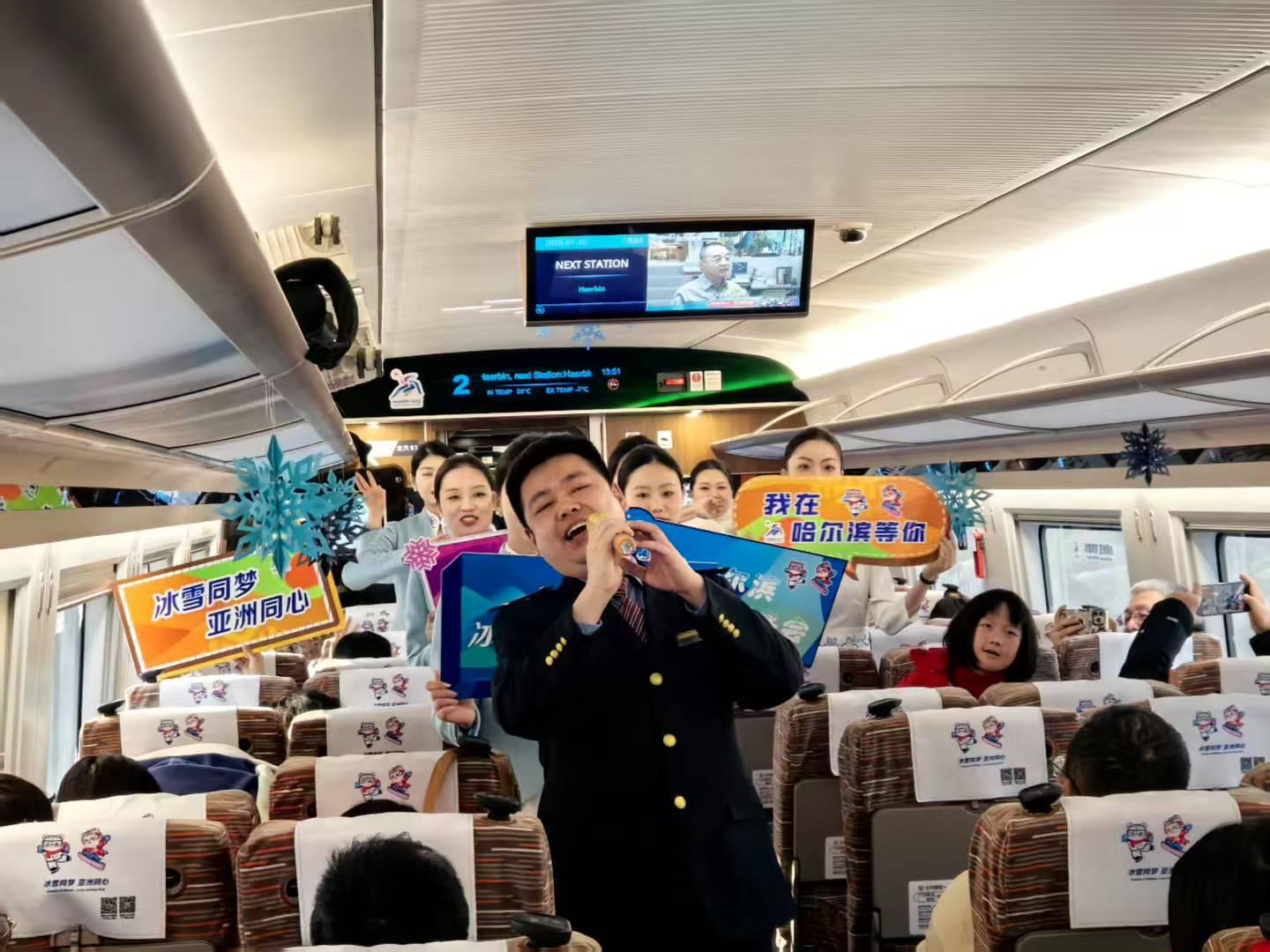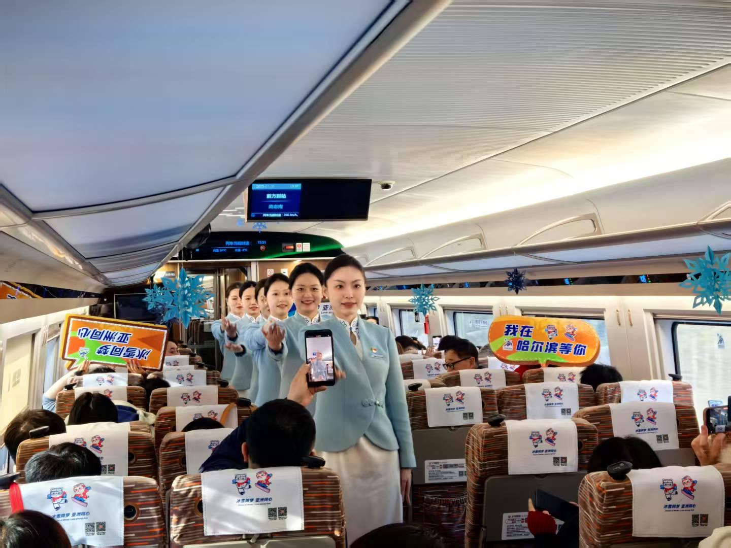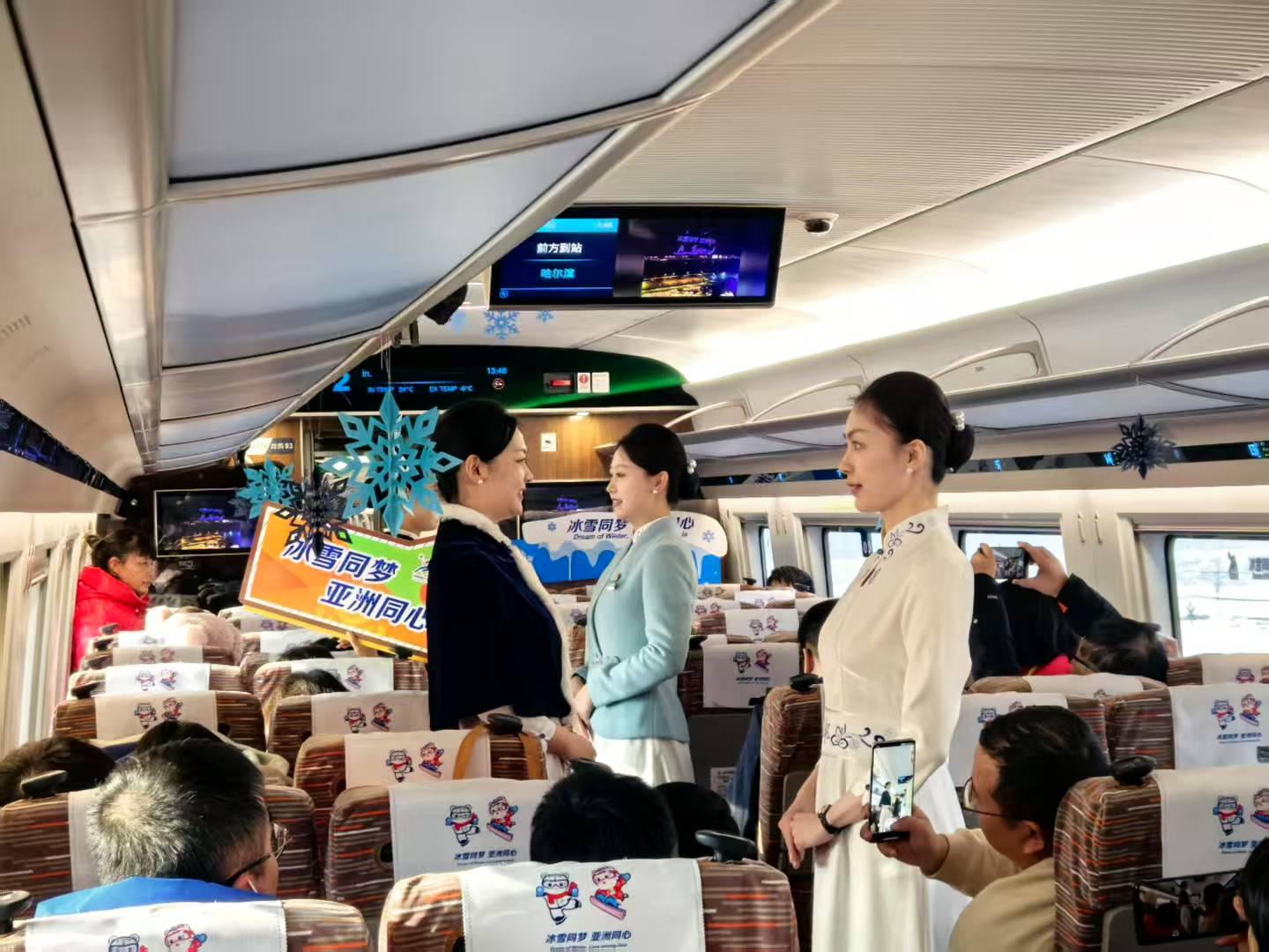 具有亚冬冰雪元素的全新制服展示了哈尔滨亚冬会铁路服务团队的专业形象。亚冬专线列车使用新型高寒复兴号智能技术提升型动车组,在智能化、人性化等方面得到新的提升和突破,运动员和旅客出行体验更舒适。