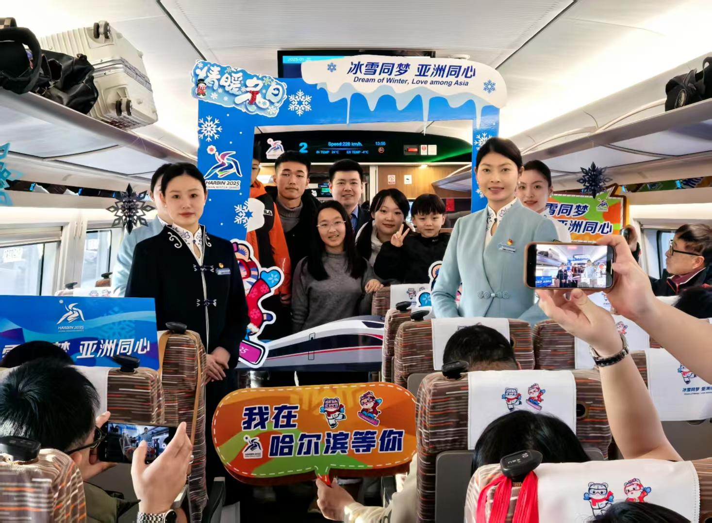 亚冬专线是哈尔滨局集团公司保障哈尔滨亚冬会专门制定的运输方案,包含高铁和普速。其中哈尔滨至亚布力西站间增开6列“点对点”高铁列车,哈尔滨至亚布力南站间增开6列“点对点”普速列车。与此同时,哈尔滨局集团公司安排经停亚布力西站的高铁列车增开至51列,赛事区域间最短间隔7分钟便有一趟高铁列车开行,列车运行最快时间为1小时2分。经停亚布力站的普速列车增开至12列,首次增开北京至亚布力南站间的直通普速列车,为赛事运输提供充足的运力保障。