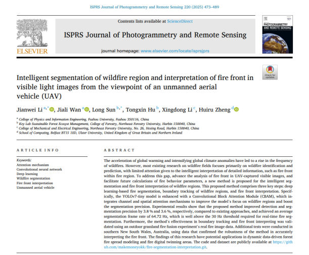 在技术验证上,他们通过黑龙江帽儿山实验林场、澳大利亚新南威尔士州等实验,对真实火场图像序列进行了火线追踪与解析,成功证明了新方法的检测和分割精度等较现有技术显著提升,并实现了火线的实时自动提取。