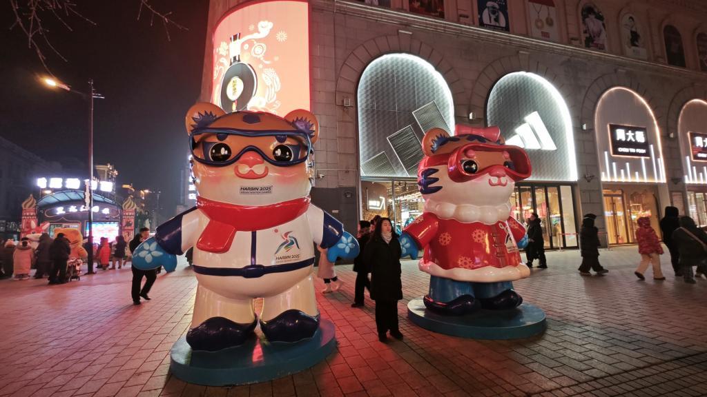 这些游客里也有许多当地人,尽管对中央大街不陌生,他们也愿意在零下二十摄氏度的夜晚来这里游玩,和亚冬会吉祥物“滨滨”和“妮妮”合影打卡。来自吉林的罗女士在哈尔滨经营着一家烧烤店,在闲暇时带着女儿和母亲到此休闲;从北京赶来的女孩小汪和闺蜜一起吃着冰糖葫芦,感受“尔滨”的活力。