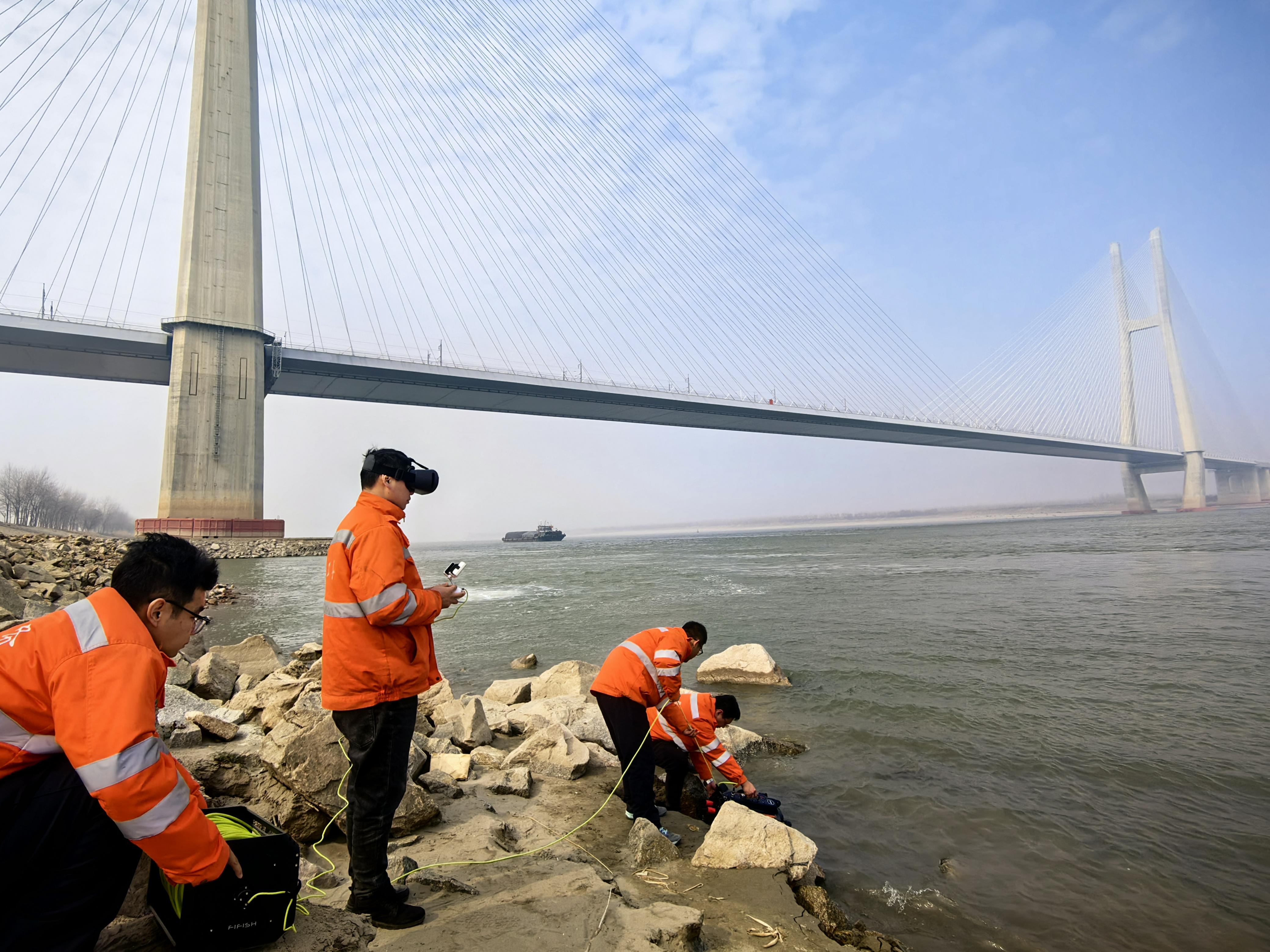 “VR体感良好,设备水下工作正常。”程亚卓操控着水下机器人,“感觉身临其境,视频很清楚,有一些贝类附着在桥墩上。”