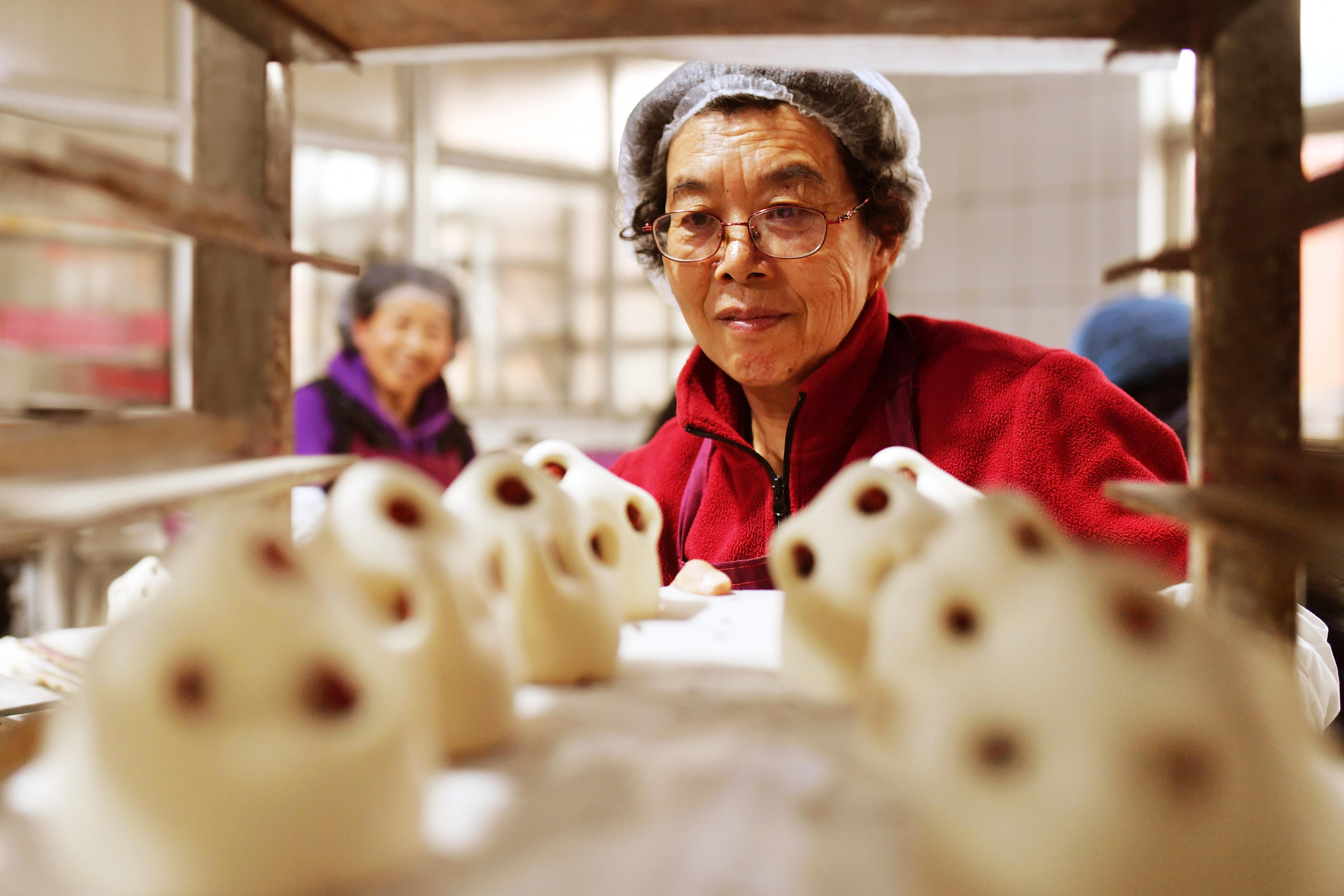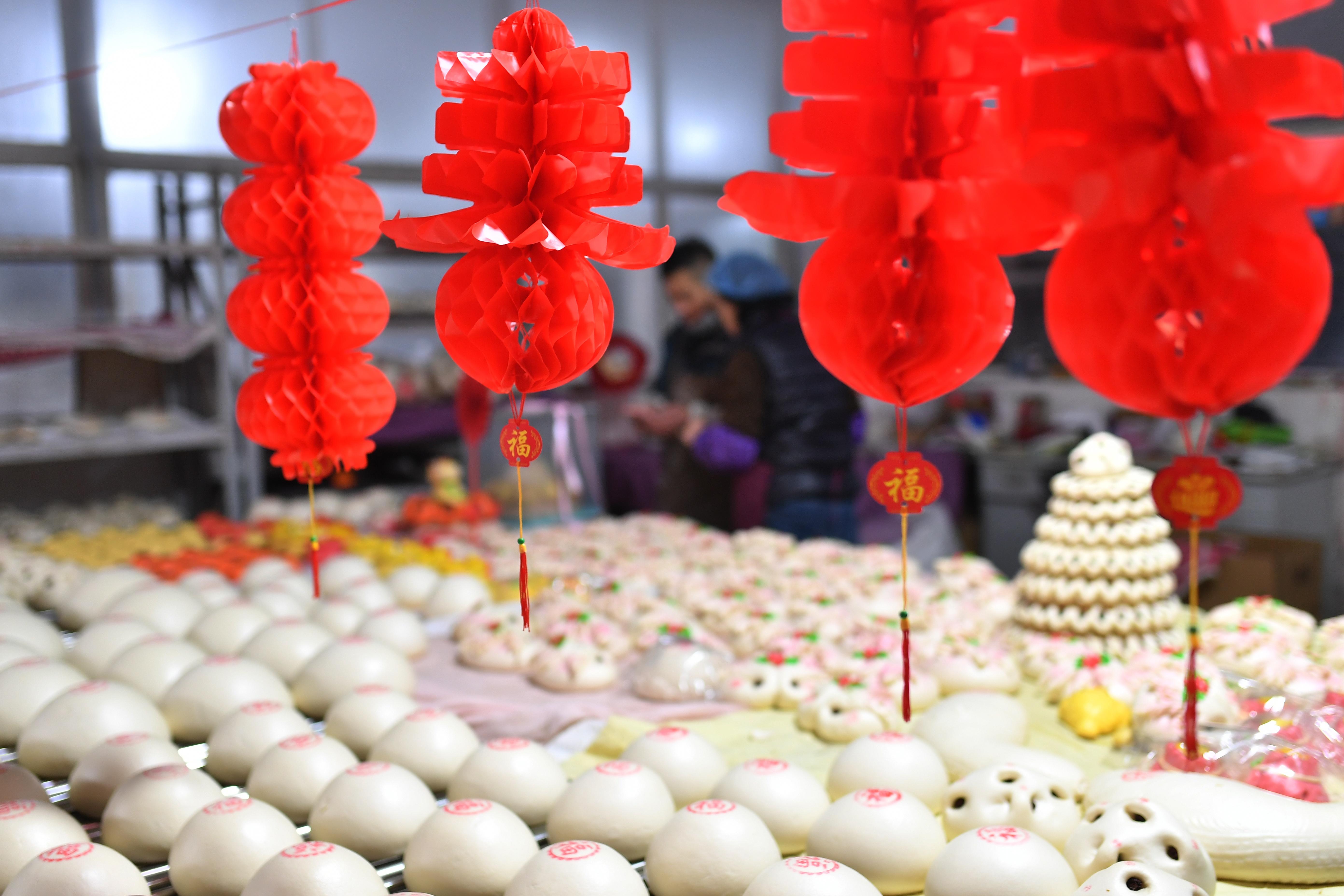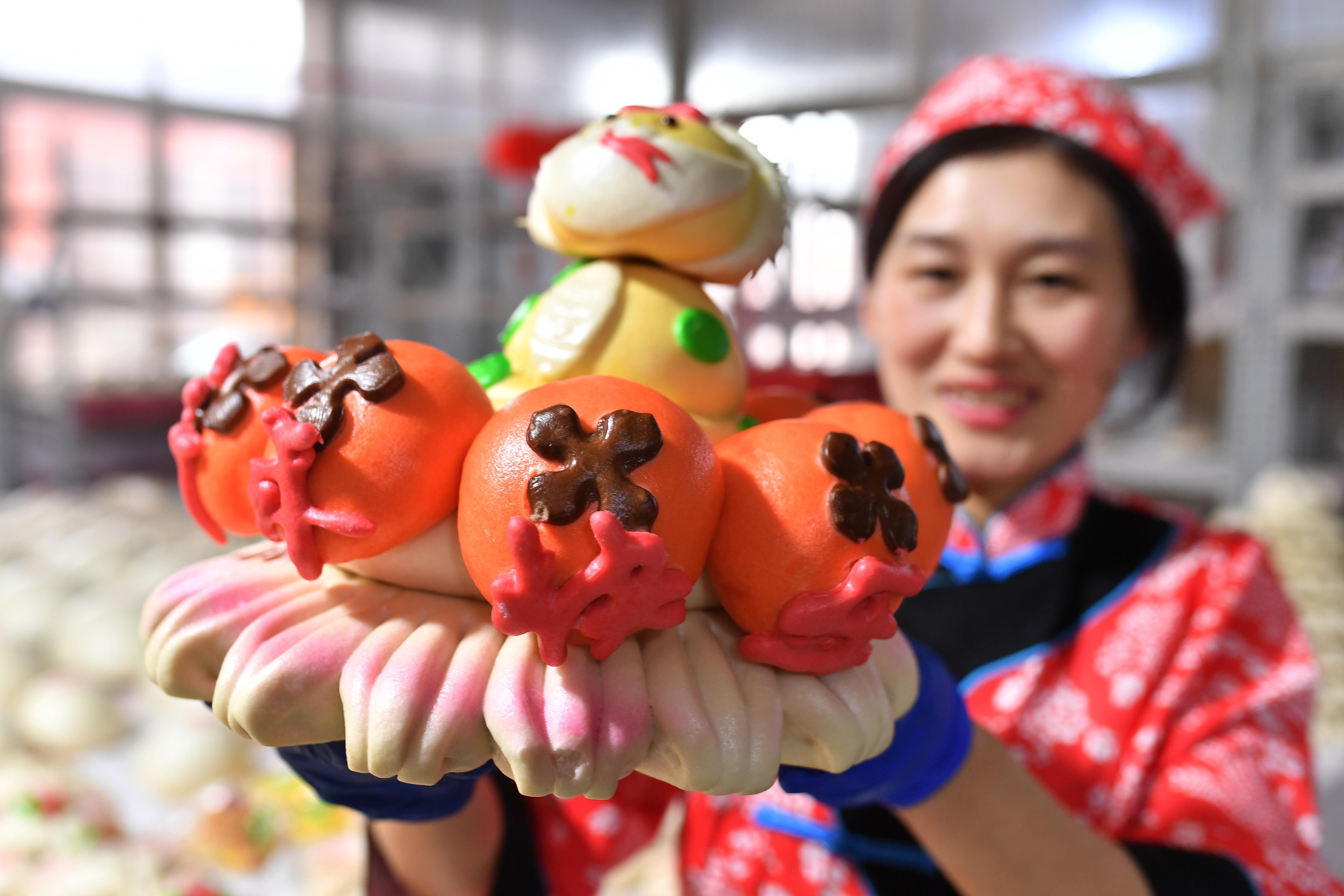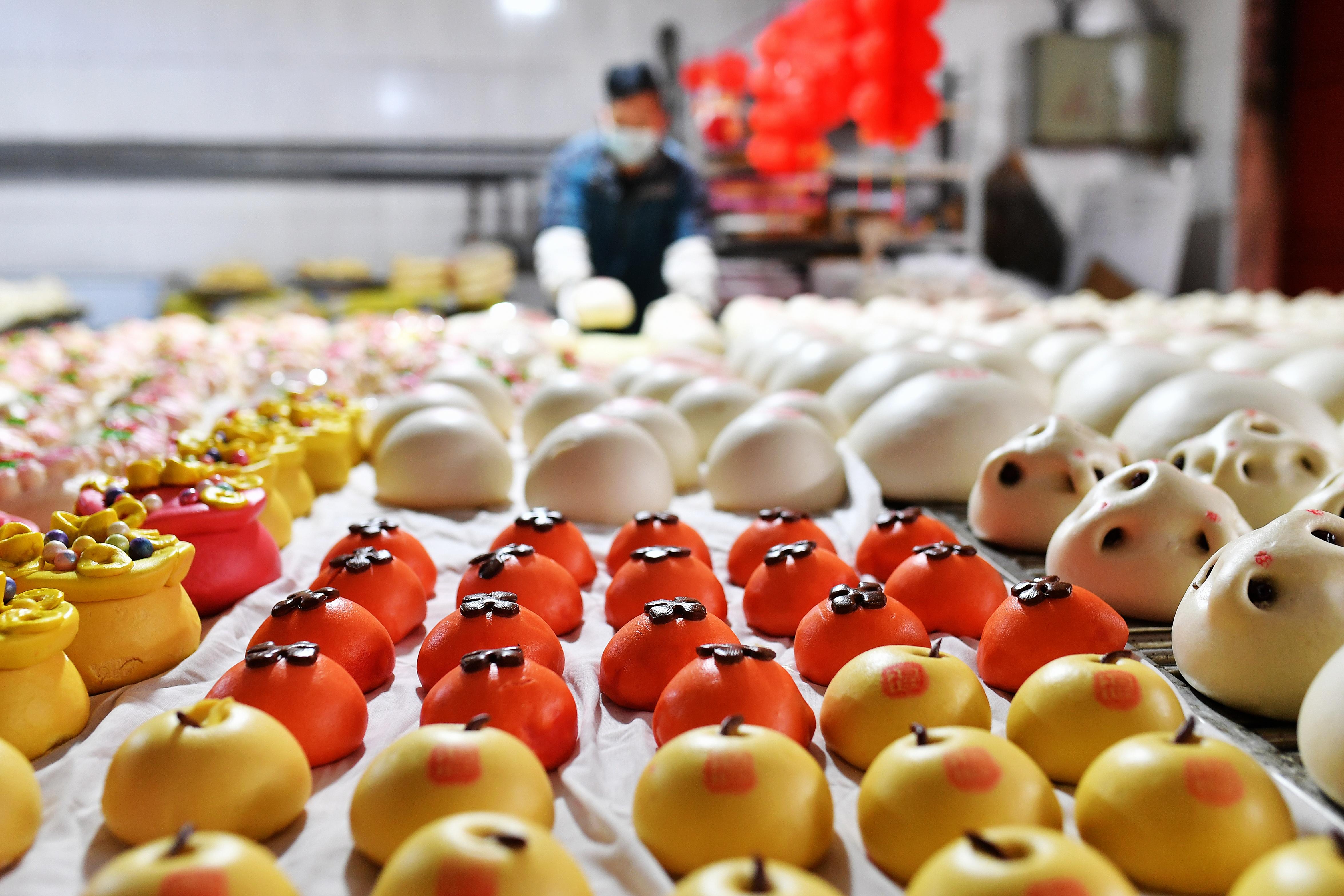 蛇年春节临近,1月23日,在山东省青岛市城阳区红岛街道观涛社区的一家花馍店,工人正在赶制胶东传统面食。寓意吉祥的“柿柿如意”“枣饽饽”“福馒头”等各式花馍,造型别致,面香四溢,蒸出了浓浓年味。