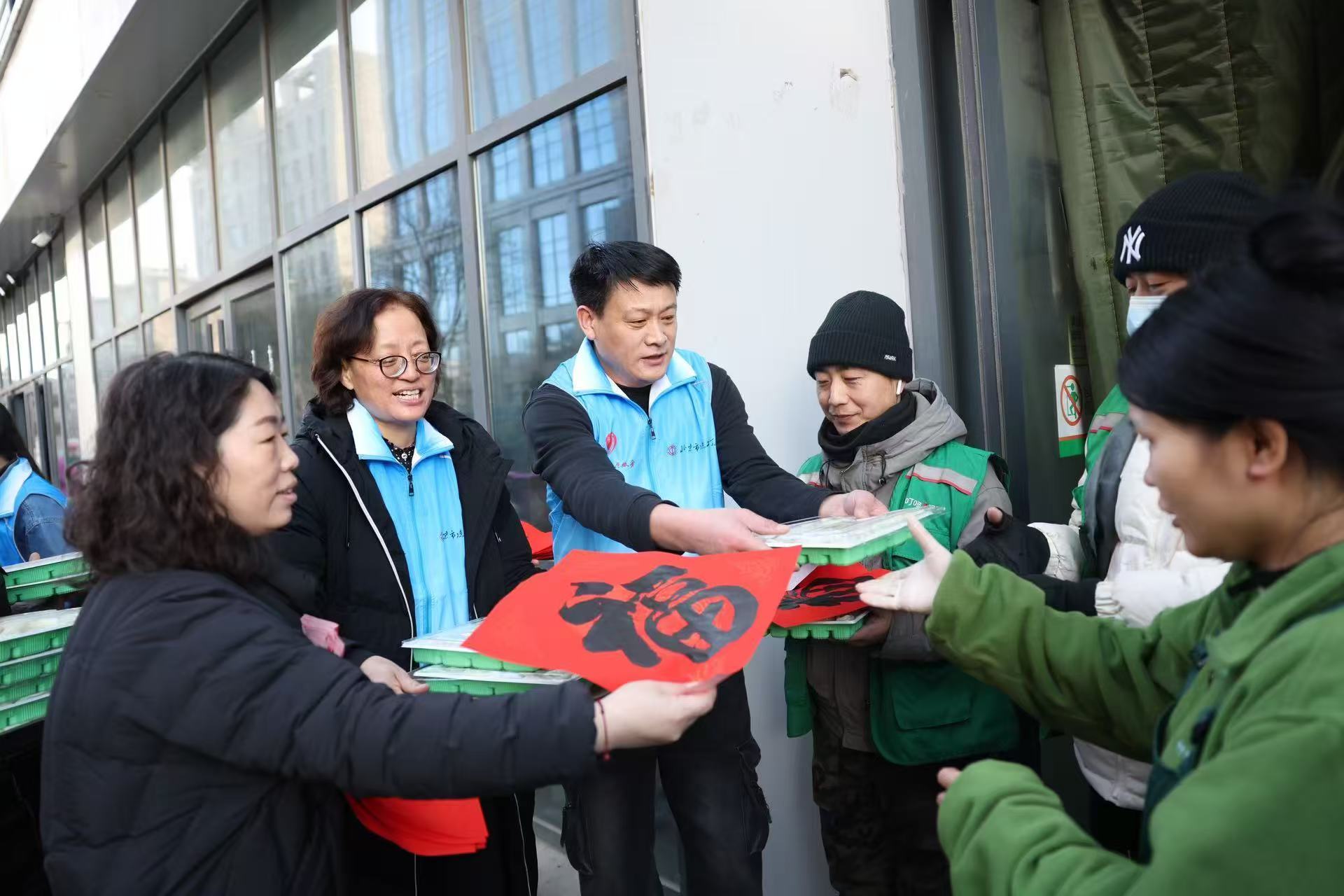 活动现场,煮好的饺子被分别装盒包装好,晾干的春联和福字被悉心折好,一起作为新春礼包被送到辖区还坚守岗位的新兴领域群体手中。志愿者们将一份份寄托着大家的祝福和真切关怀的饺子和春联送给他们,并叮嘱他们努力工作之余要注意保暖。