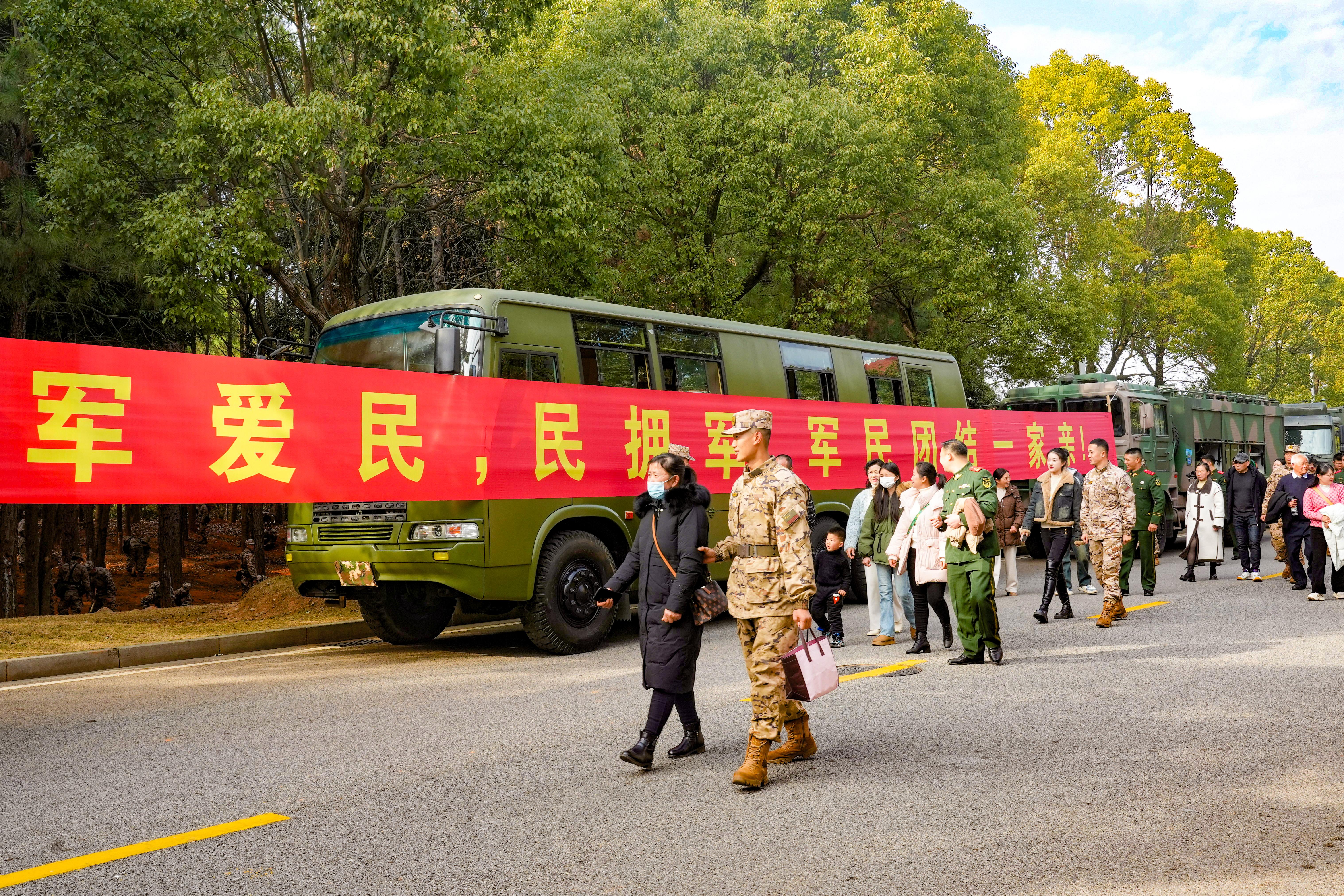 当天下午2时30分,载着乡亲们的大巴车缓缓驶入,他们受邀走进军营,看部队变化、叙过往家常、看双拥晚会,感受新时代革命军人风采。