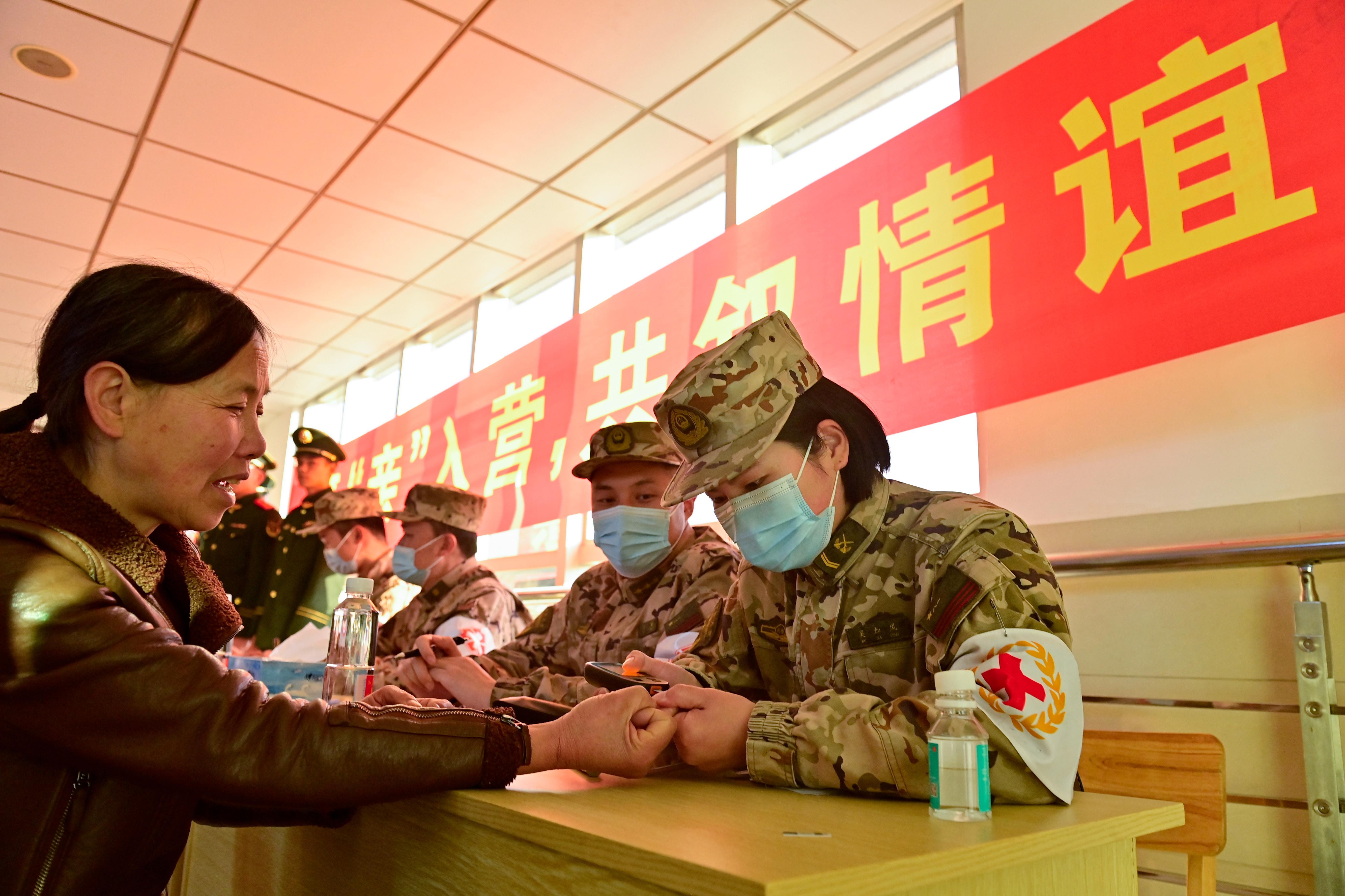 “阿姨,您最近身体哪儿不舒服呀?我给您先测一下血压。”军医微笑着俯身,轻声询问,“这个药是饭后吃,一次吃一粒,我给您写在单子上了……”军医拿起笔,在药盒显眼处写上服用时间与剂量。