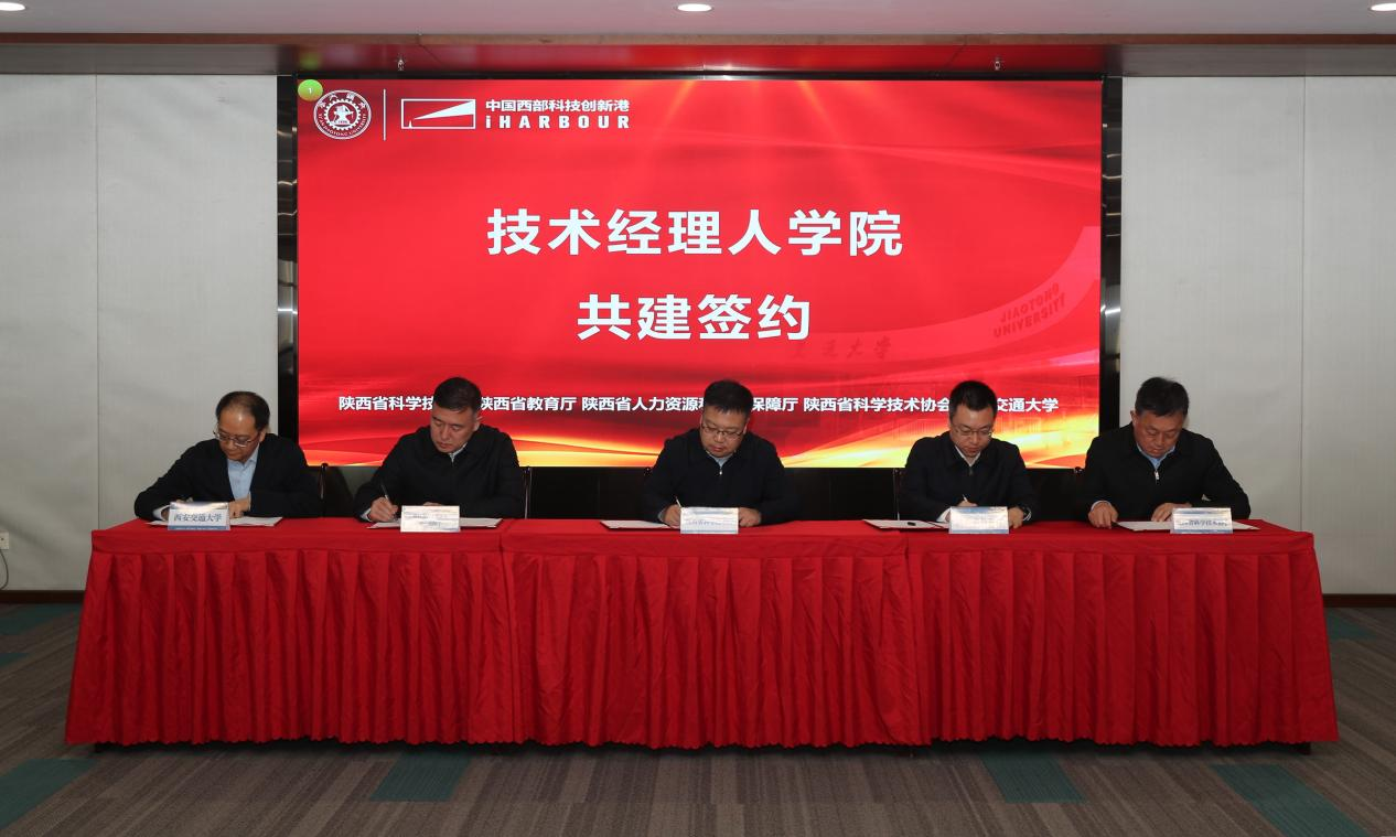 活动现场,陕西省科学技术厅、陕西省教育厅、陕西省人力资源和社会保障厅、陕西省科学技术协会、西安交通大学五方签署了共建技术经理人学院协议。