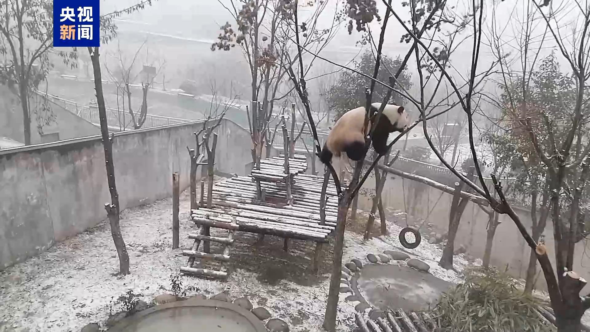 雌性大熊猫“丫丫”威武地站在高高的树上,不停摇晃着树枝,像是要把树上的雪也摇下来。