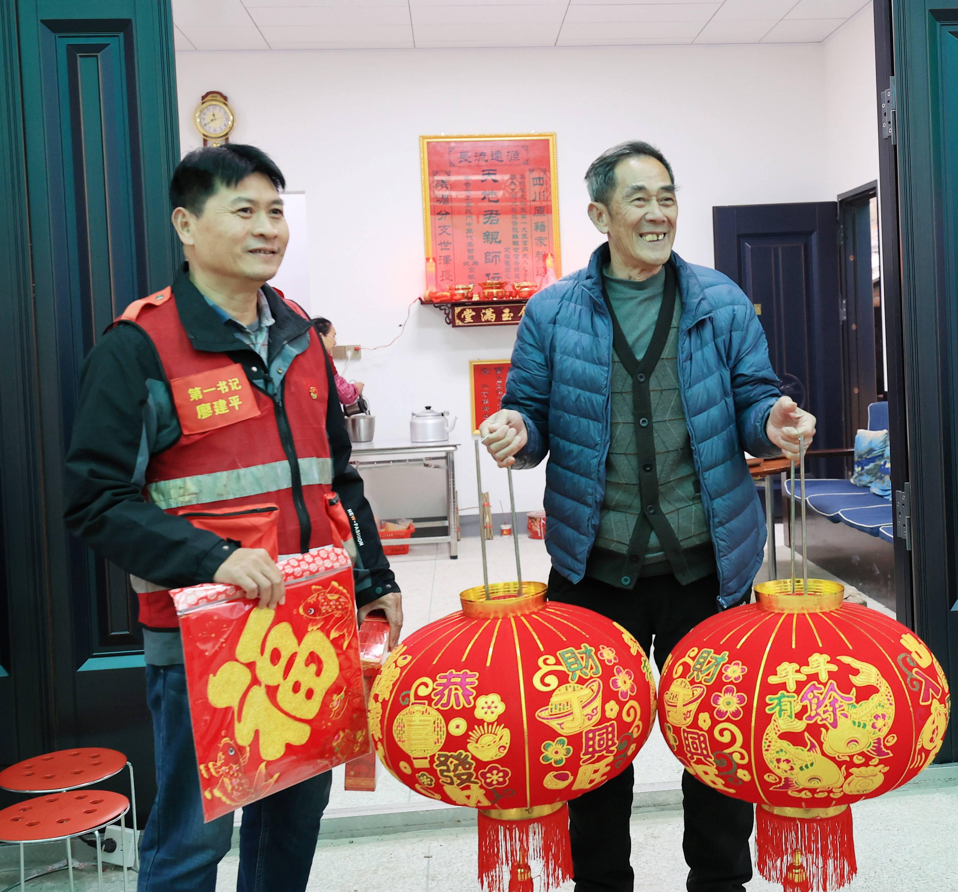 1月24日,广西柳州市融安县板榄镇泗安村因2024年“7.1洪灾”倒塌房屋的群众搬进新房,当地驻村第一书记、工作队员和镇村干部,为搬进新房的群众送春联、送灯笼、送祝福,让受灾群众感受党和政府的温暖,过一个温暖祥和的新春佳节。