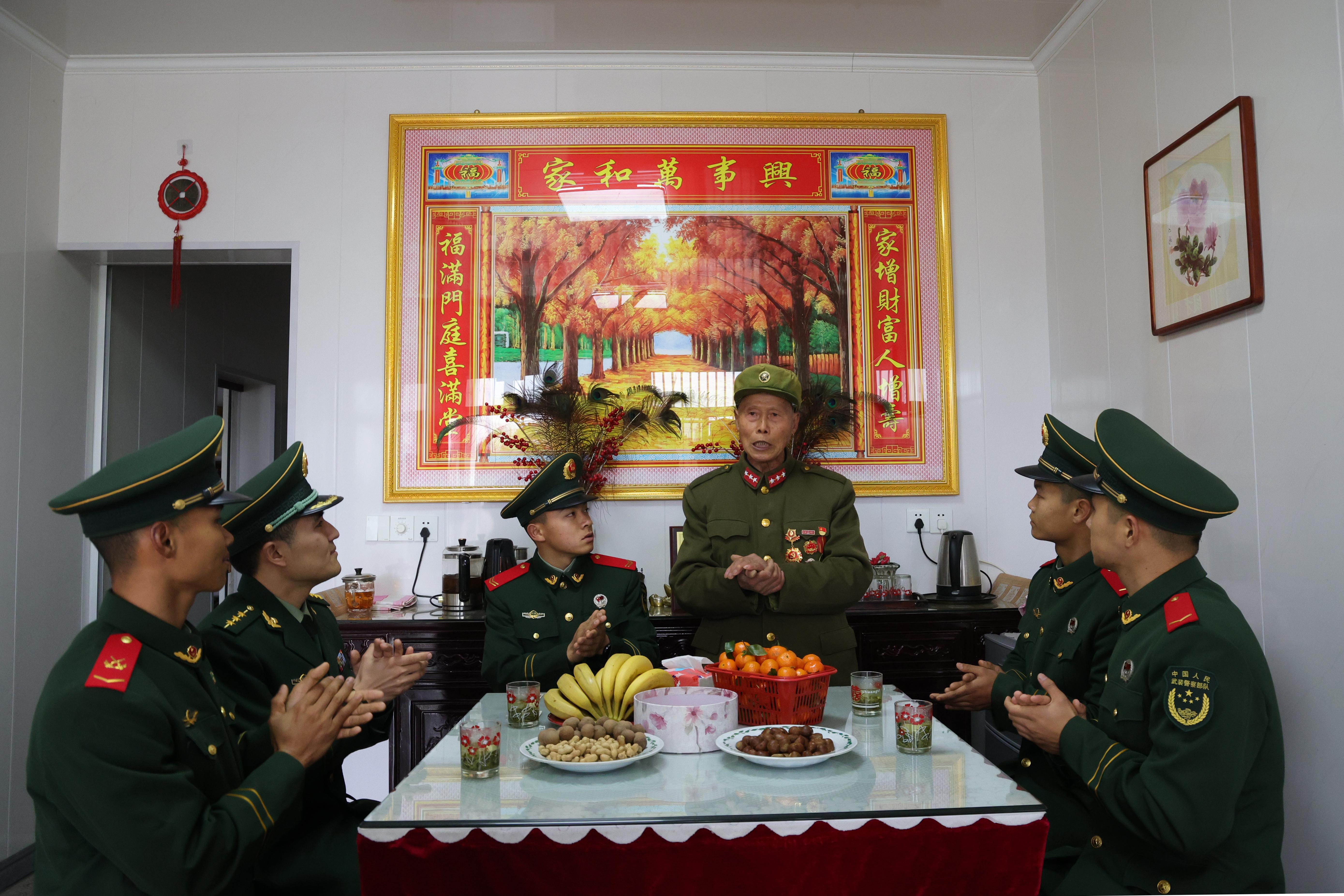 春节前夕,武警第二机动总队某支队红军连指导员江潮带领中队官兵来到驻地退役老兵蒋伯根家中拜访慰问。