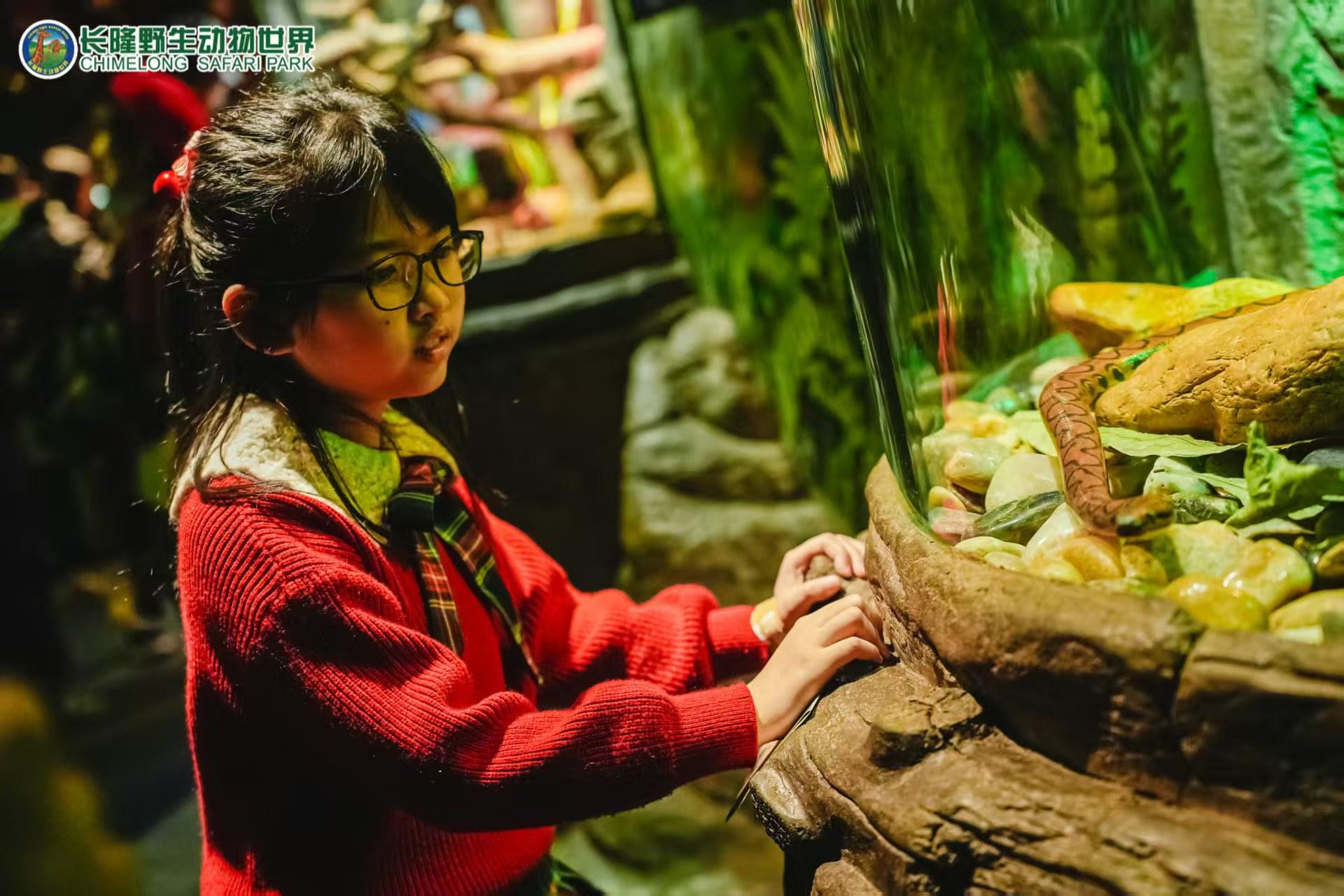 升级亮相的新场馆,展出了二十多个珍稀蛇类品种、300多条蛇,更有五大金蛇震撼登场。场馆全新升级数字化科普互动,带给游客观蛇新视角:可站在透明的玻璃地板上,欣赏神秘的“地下”蛇居;深入“螭幽曲径”,了解蛇的生活习性、生理特征;在“七彩宫”,游客可享受用“蛇”眼看世界的乐趣。