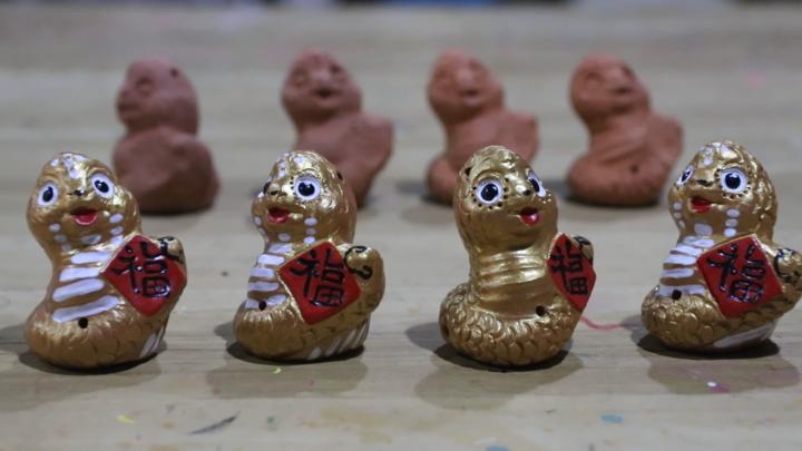 蛇年春节,贵州桐梓泥哨传承人姚德波手工泥制出生肖作品“蛇宝”,寄托了对新年的美好祝愿。