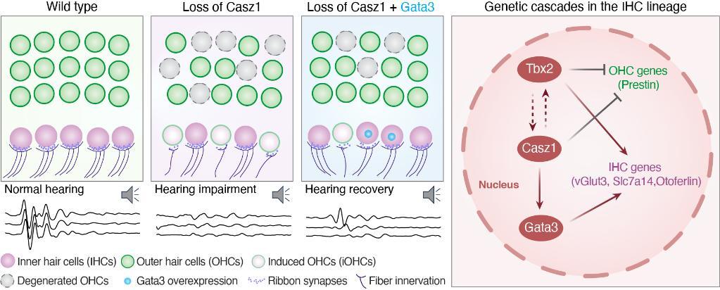 “我们通过在单细胞水平分析内毛细胞和外毛细胞的显著差异表达基因,发现了Casz1。它是一个锌指转录因子,也是一个古老的决定细胞功能和命运的基因,但其在耳蜗毛细胞中的功能还一无所知。”刘志勇说。