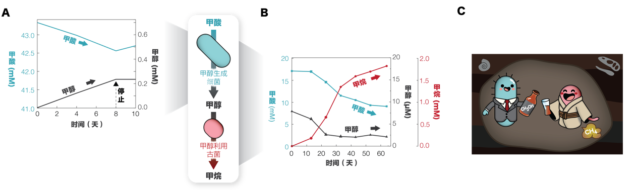 我国科学家前期从地下油藏先后分离获得了厌氧细菌新科物种嗜甲酸赵氏杆菌,以及吃甲醇产甲烷的厌氧古菌新科物种胜利甲烷嗜热微球菌。嗜甲酸赵氏杆菌是一位“酿假酒大师”,通过一种全新的途径,巧妙地将甲酸“酿造”成甲醇。这位大师虽会酿酒却不胜酒力,随着甲醇的积累,整个酿造过程会逐步停滞。胜利甲烷嗜热微球菌虽不会酿酒,却是专门吃甲醇的“醉翁”,它的出现,不仅协助嗜甲酸赵氏杆菌持续酿“甲酸”产“甲醇”,解决了甲醇累积的问题,还将甲醇转化为甲烷,持续生成天然气。