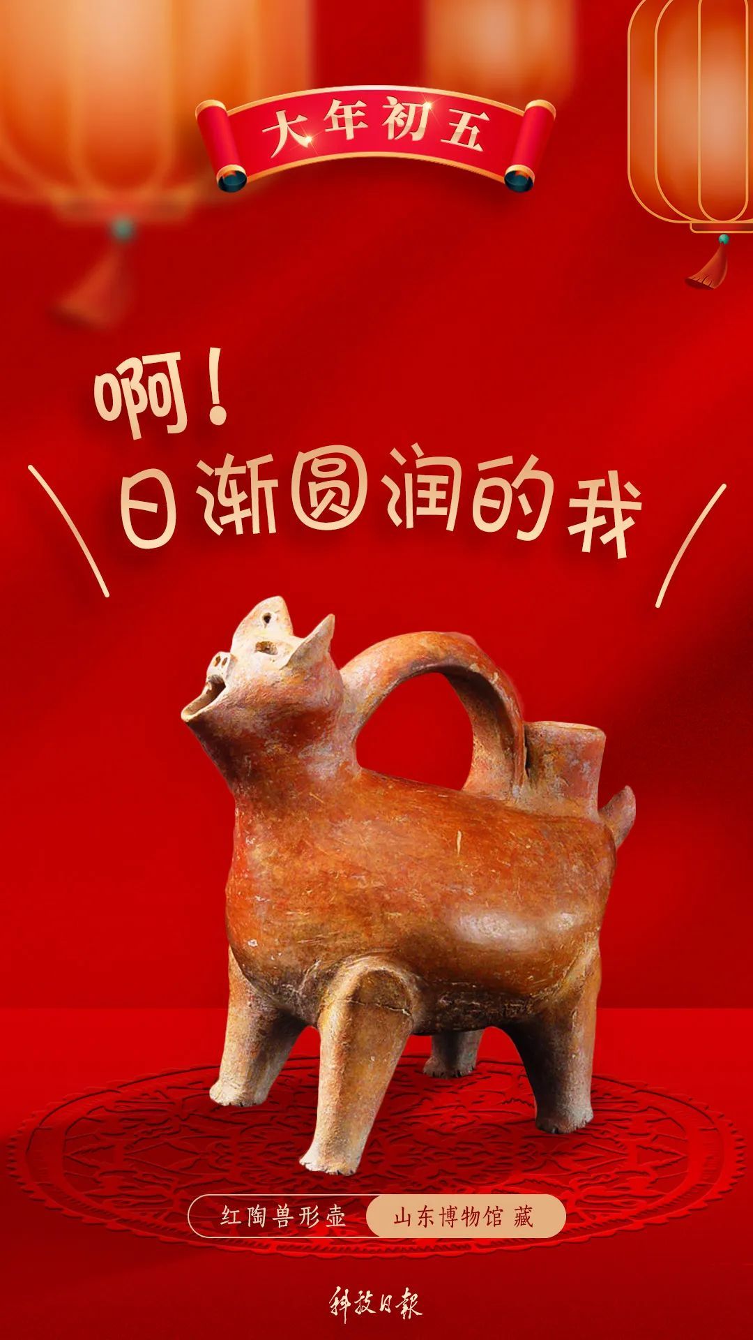 这个萌态十足的陶器,便是馆藏于山东省博物馆的“网红小猪”——红陶兽形壶。它的脑袋和身体像猪,耳朵、四肢和上翘的尾巴又像狗,因此被命名为“兽形壶”。你看它圆润的身体张大的嘴,一看就是个“干饭能手”!