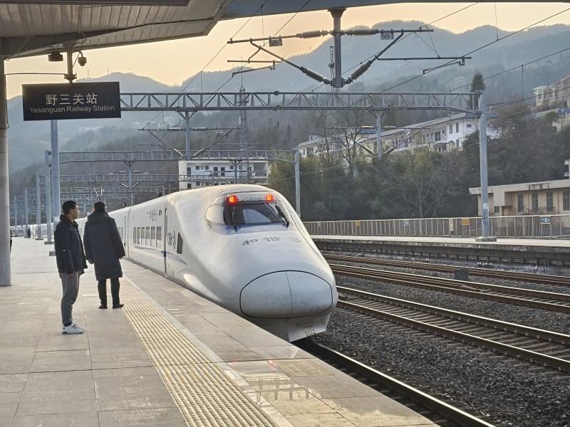 8时,清晨的野三关站热闹起来,身背行囊的乘客从大山深处的村寨走进车站,迈向山外的广阔天地。一列动车组静静地停靠在站台,一声悠扬的风笛鸣响,满载旅客安全地驰骋在武陵山间。