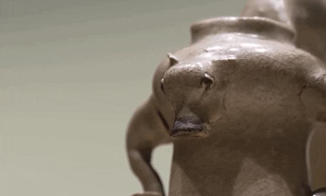 双蹄叉腰,憨态可掬,这件现藏于浙江省博物馆的瓯窑青瓷点彩牛形灯盏,出土于上世纪50年代浙江温州的一处东晋墓地,距今1600多年,是国家一级文物。
